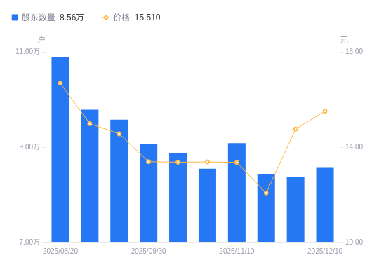 日期A股户数(户)流通A股户均持股数(股)户均持股市值(万元)2025-12-10856505366.168.322025-11-28836665493.418.112025-11-20844165444.616.582025-11-10908365059.806.762025-10-31854845376.587.192025-10-20886605183.986.932025-09-30905965073.206.792025-09-19957864798.326.992025-09-10978534696.967.042025-08-201089164219.877.04