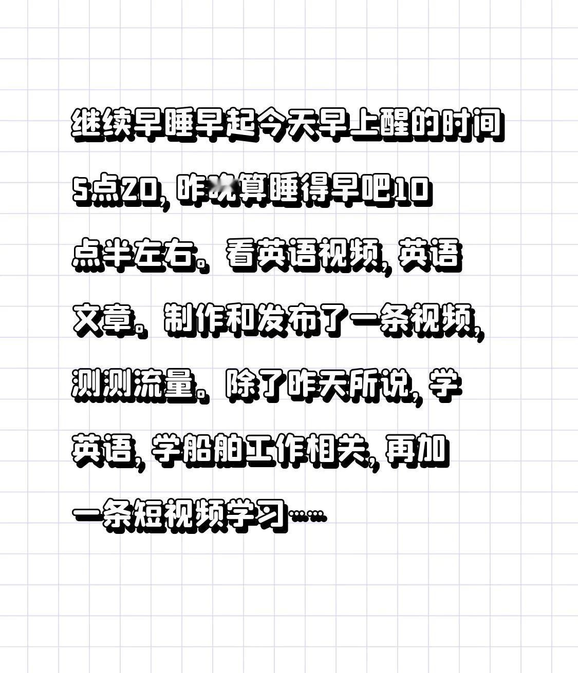 继续早睡早起 今天早上醒的时间5点20,昨晚算睡得早吧10点半左右。 看英语视频,英语文章。制作和发布了一条视频,测测流量。 除了昨天所说,学英语,学船舶工作相关,再加一条短视频学习……