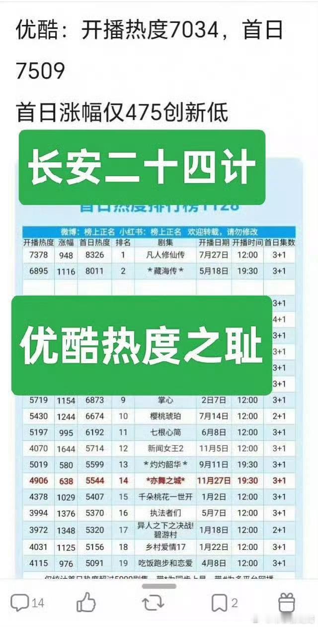 不看不知道,一看吓一跳,24计在没有开播的情况下,热度垫底7000(这个操作只有优酷能解释),然后在首日和云包场的刺激下,播了一个晚上热度涨幅只有400多,创下优酷热度涨幅最低历史。 优酷今年所有剧集都是开播第一集免费,后面🔒V诶,只有24计热度涨幅最低天啊