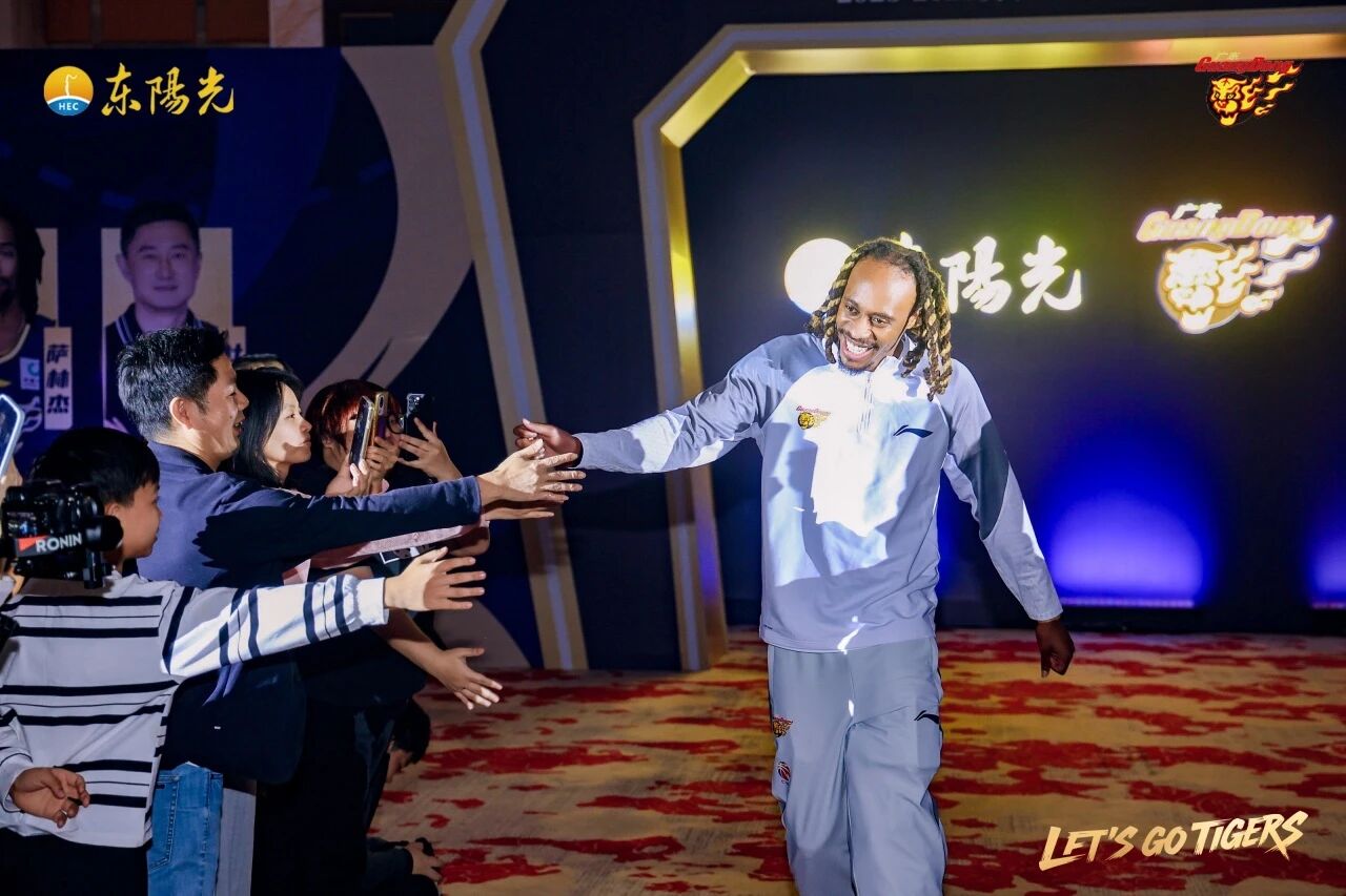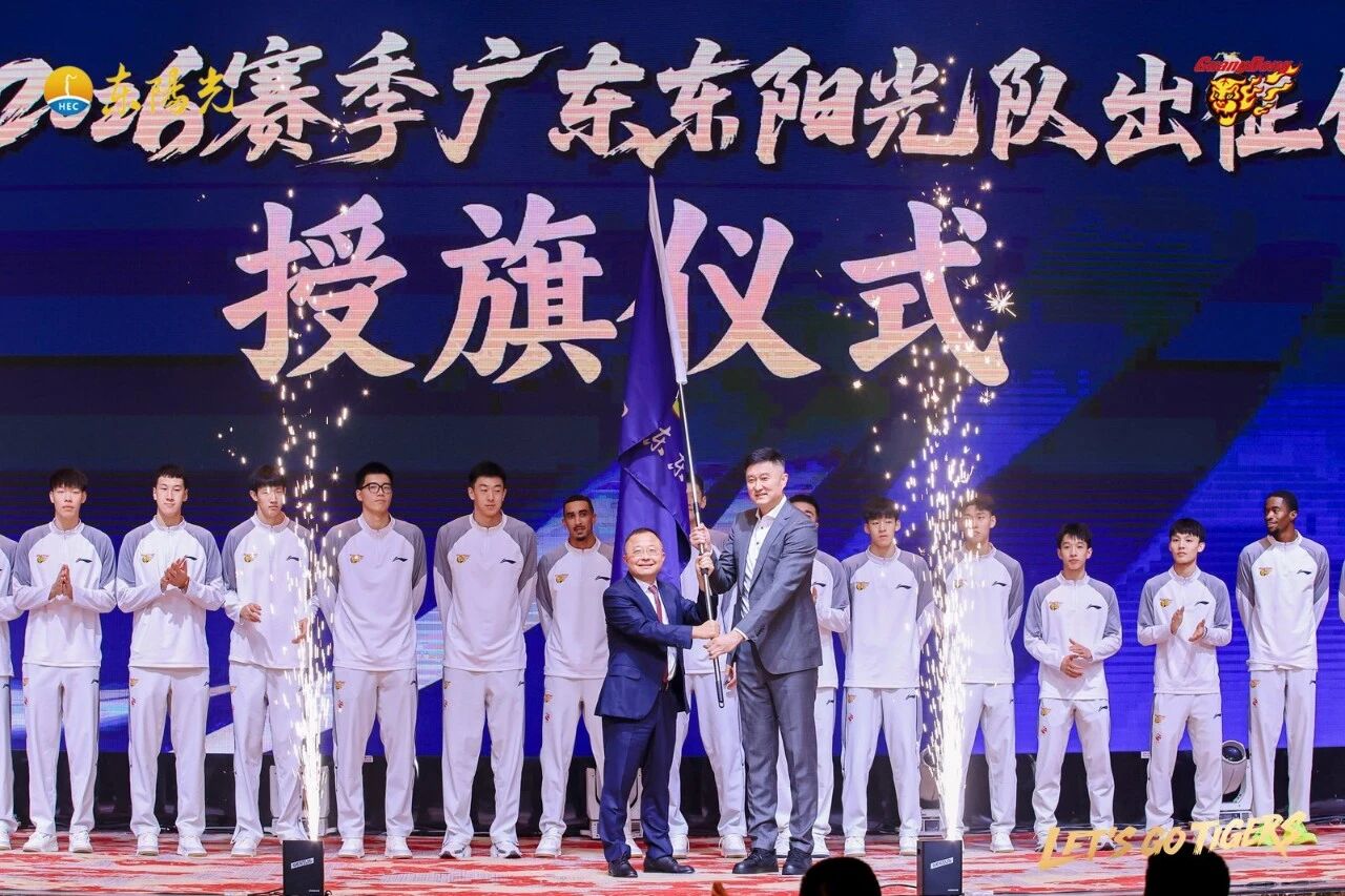 东阳光集团董事、总经理唐新发先生亲手将出征战旗郑重交付广东东阳光队主教练杜锋,寄予球队新赛季再夺佳绩的殷切厚望。随后,杜指导挥舞旗帜,全场高呼“LET'SGOTIGERS”,助力华南虎朝着更高目标迈进。