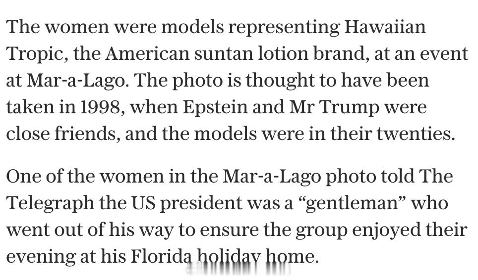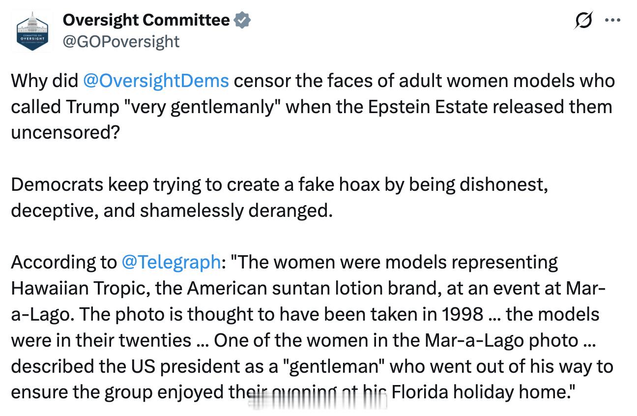 众议院监督委员会的民主党人公布了几张来自爱泼斯坦的川普照片,并将照片中女性的脸部涂黑,引发外界猜测这些女性可能是受害者。但现在未打码的照片显示,川普当时(1998年)是和几位已成年的防晒品牌Hawaiian Tropic女模特站在一起。并且其中一名女性后来接受采访时表示,当时她22岁,记得川普“人很好”、“很有绅士风度”。另一张被打码的照片中,川普似乎在一架私人飞机上,身旁坐的金发女子同样是成年人,脸部也被涂黑。爱泼斯坦遗产的法律团队在照片提交国会前确实提出过打码请求,但最终决定遮挡哪些内容的是国会工作人员。众议院监督委员会的官推回应到:“民主党人仍在用不诚实、误导性甚至毫无底线的方式,反复试图制造一场虚假的闹剧。”海外新鲜事今日焦点