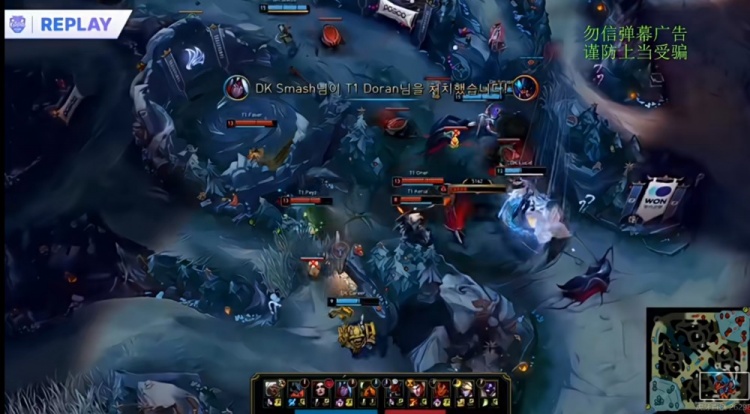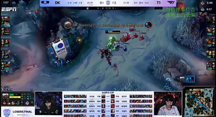 [13:52]下路没大的Doran雷克塞主动动手,结果被Siwoo安蓓萨反杀找回场子!回头Career泰坦绕后配合队友还在河道逮捕了Oner杰斯!DK再打0换2!