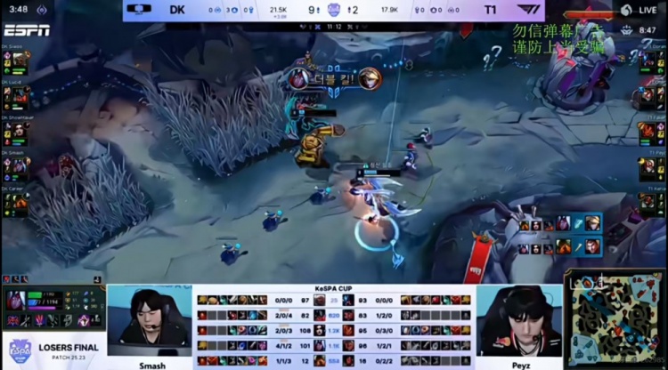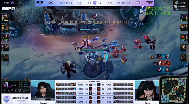 [11:10]河道T1野辅强动DK下路组失败,Lucid剑魔支援赶到,一个Q3配合Smash维鲁斯一箭先秒牛头!随后SMK乐芙兰绕后赶到,DK完美越塔再打0换2!Smash维鲁斯又是双杀!这波打完DK拿下4K经济优势!再拿第一条小龙!但是Siwoo安蓓萨立马下路想搞单杀结果白给!