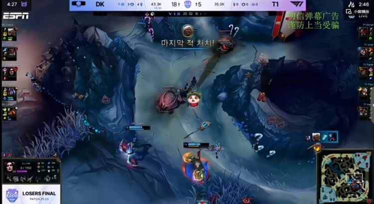 [20:15]T1四人河道强动Lucid剑魔但是被他回血拖了太多时间!Siwoo安蓓萨进场双杀,侧翼SMK乐芙兰虽然倒下,DK中野两人送出赏金,但是Smash维鲁斯高伤害配合安蓓萨收割了残局啊!DK团灭T1!