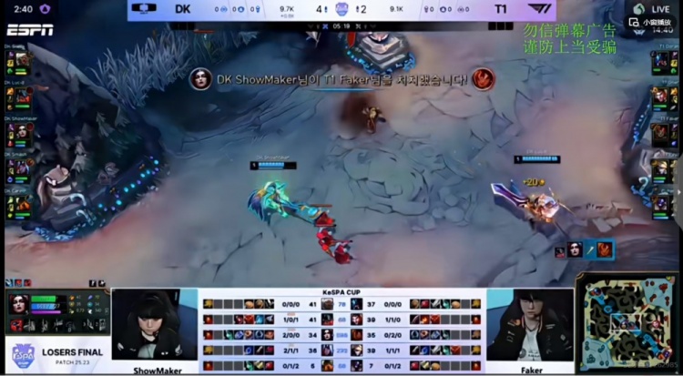 [2:54]许许的哥!ShowMaker乐芙兰抢3级,一套E闪直接对位单杀Faker岩雀!随后T1下路三人强行越塔被DK下路组操作,Lucid剑魔支援赶到,这波Smash维鲁斯双杀,T1这边则是下野各自拿到一个击杀,DK打了个2换3!