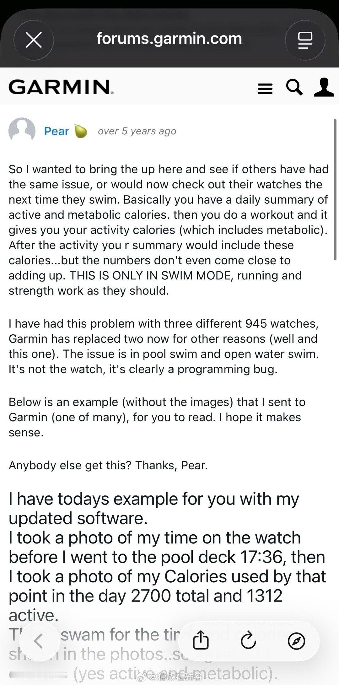 今天的游泳热量数据又出现了荒谬偏差,匀速游泳一个小时居然显示消耗近5000大卡。这个问题我去年就遇到过,看来还是没有得到解决;随手搜了一下,原来五年前就有人吐槽过,之后不断有人反馈,依然没有debug。不知道是硬件或者算法的问题,是Garmin解决不了的死穴bug。
