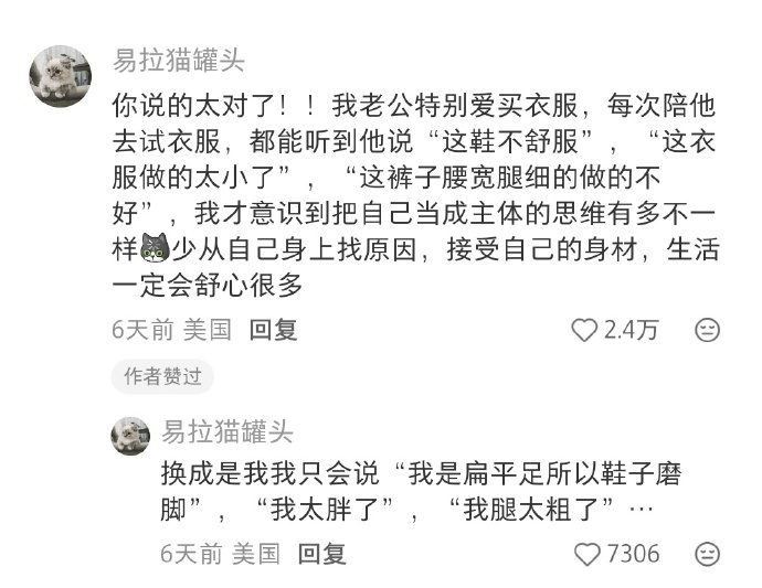 看到一个帖子,作者说,在东京lululemon打工,看到很多女性明明很瘦却认为自己胖,或者即使别人都说好看,自己却看不到自己的优点。自怨自艾。我觉得之所以产生图中这样的状况,源于男性和女性在命理构造上是两个完全不同的群体。对女性而言,世界的另一半人(男性)是女性的官杀,,克我者为官杀,那么女性的意识里面世界的构成就是两部分:自己这个群体,与外部的压力。官杀也可以理解为社会对女性的规训、评判与期待。因此女性无时无刻都不被生活在审视、挑剔规范的世界当中。甚至女性内部的相互审视。女性常常被教导要趋于完美——身材、容貌、行为都要符合某种标准,否则就会感到不合格,这是长期活在他人眼光与标准中的后遗症。(感觉日韩这一点已经深入骨髓了,无处不在的化妆文化,不化妆的女人似乎不够体面、不配见人活着。)而对于男性来说,世界的构成是我们(男性群体)与世界外部的财(女性),也就是我和世界上无数的好的东西资源共处,那么对男性来讲,自己就是应该处于获取资源的位置。主体性思维必然强。而且男性总体更被鼓励向外拓展、征服、获取资源(包括情感、物质、社会地位,包括女性)。所以女性很容易对自己生活充满了苛刻和审视,不断的觉得自己还有不够好的地方,一直都会从自己身上找原因。而男性却非常自信。如何看待自己,从来不只是个人问题,而是长期文化、社会、性别共同作用的影响。沈腾 肥瘦自由 我学沈腾心态 41岁女生未婚未育的真实生活
