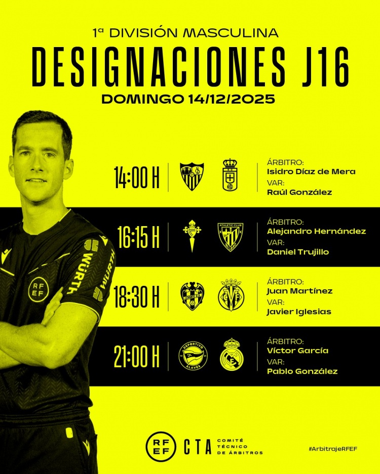 直播吧12月13日讯西甲官方公布了12月14日四场比赛的裁判安排,维克托·加西亚执法阿拉维斯vs皇马。