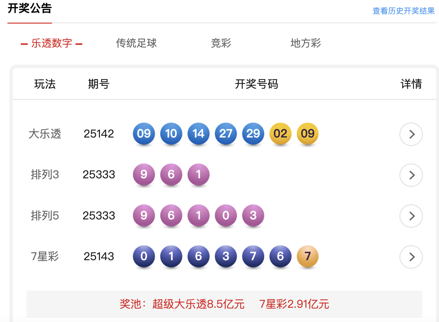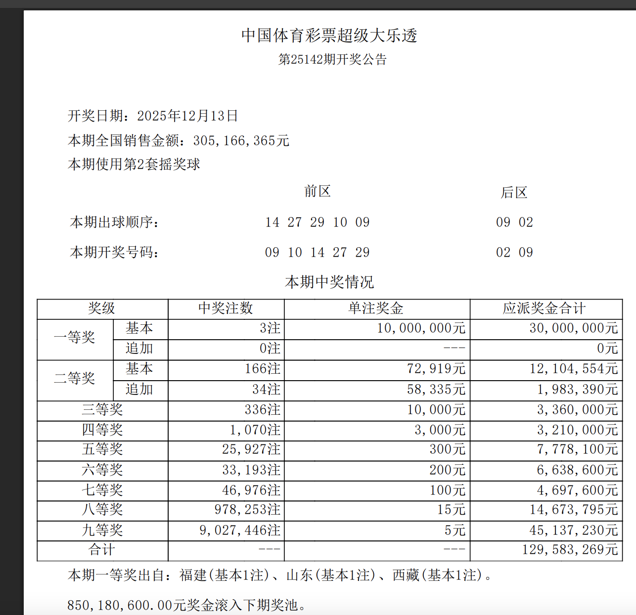 大皖新闻讯12月13日晚,中国体彩网更新彩票开奖公告。超级大乐透、排列3、排列5等玩法最新中奖号码出炉。其中,超级大乐透中奖号码为09101427290209,在全国开出3注一等奖,单注奖金10000000元。具体如下: