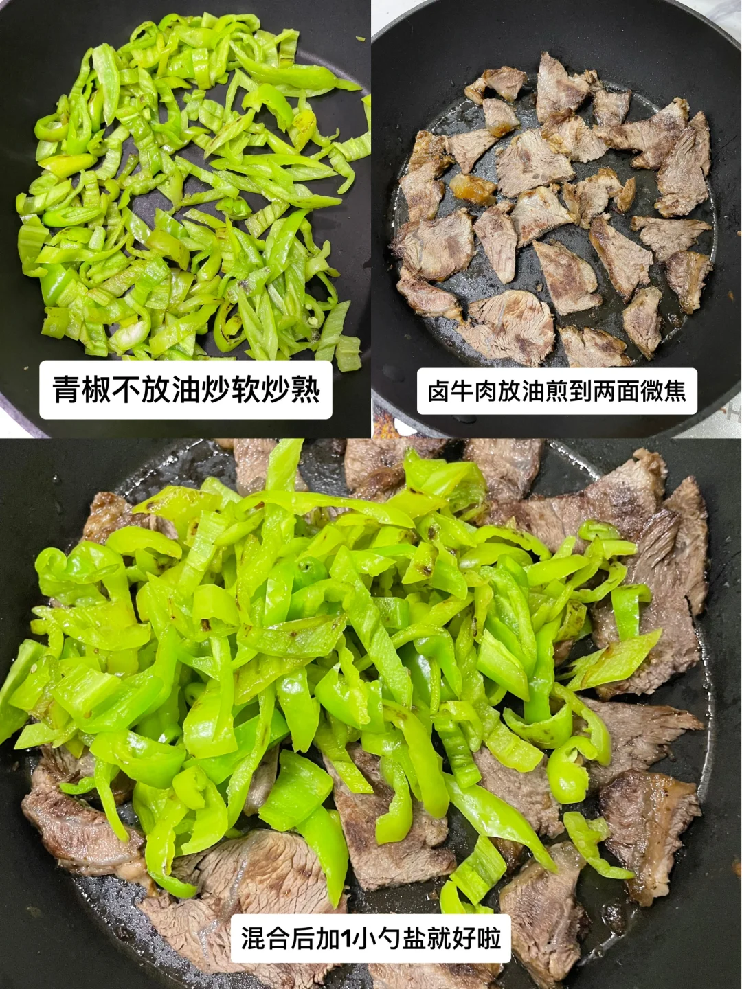 实不相瞒,卤牛肉还是年夜饭搞得😂一直冰箱冻着,翻出来用油煎一煎炒青椒,嫩嫩的太香了!