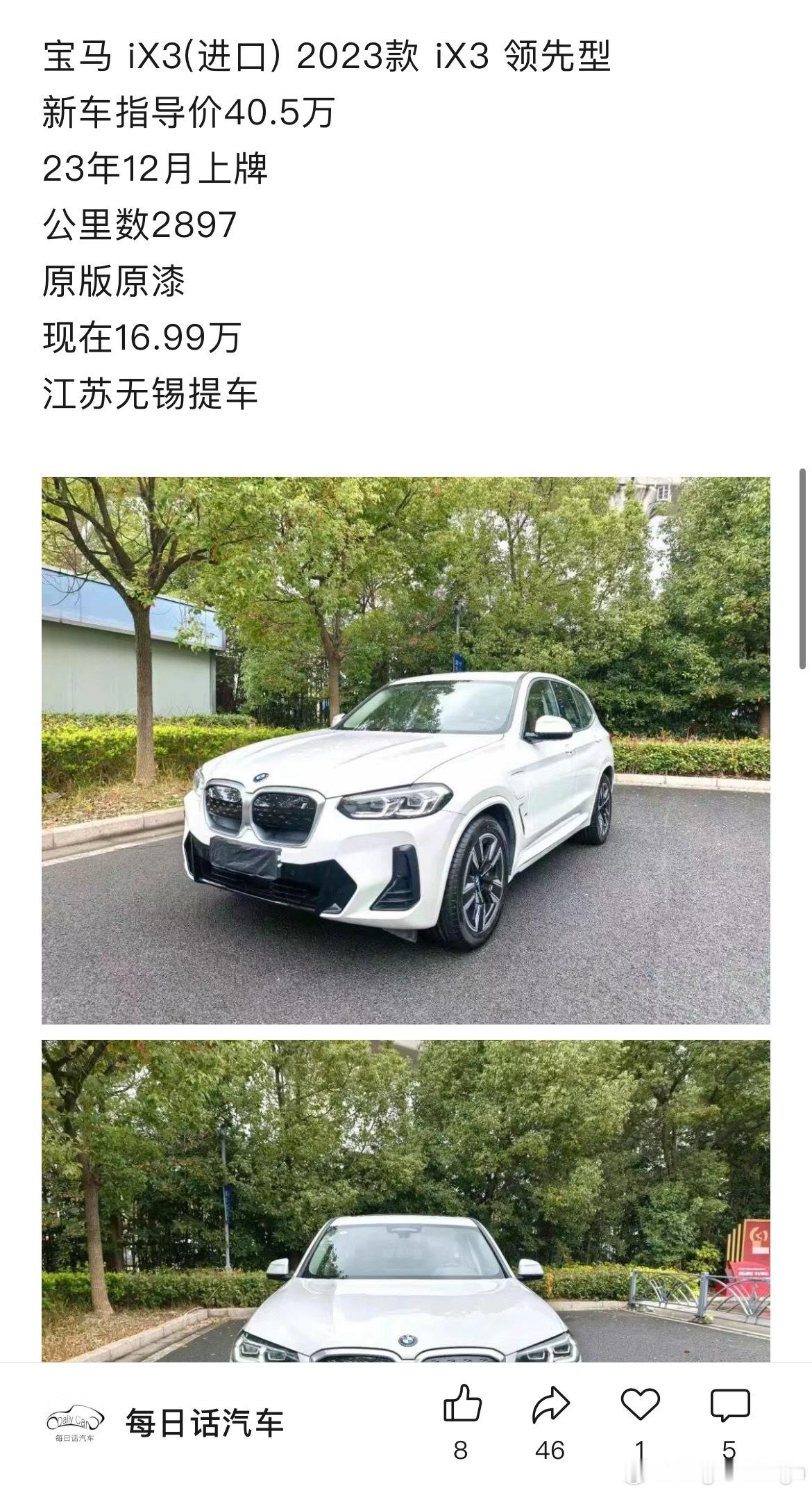 我去!白天还夸二手iX3香呢!这个更香两台iX3,一台21年底上牌行驶4500公里一台23年底上牌3000公里不到都是16.99!为啥年份差两年,应该是黑色有沪牌和高配的原因这个白色的二手真的性价比拉满!当年还考虑过这个新车,24年新车25万左右,还好那时候没买信息源来自:每日话汽车