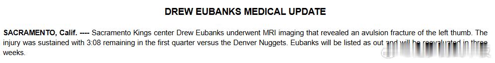 国王官方宣布,德鲁-尤班克斯遭遇左手拇指撕脱性骨折,将在3周后重新接受评估!尤班克斯本赛季出战25场,场均5.3分2.8板。在他和小萨博尼斯相继受伤后,国王正式名单中仅剩下新秀雷诺和老将萨里奇两名中锋新赛季篮不住