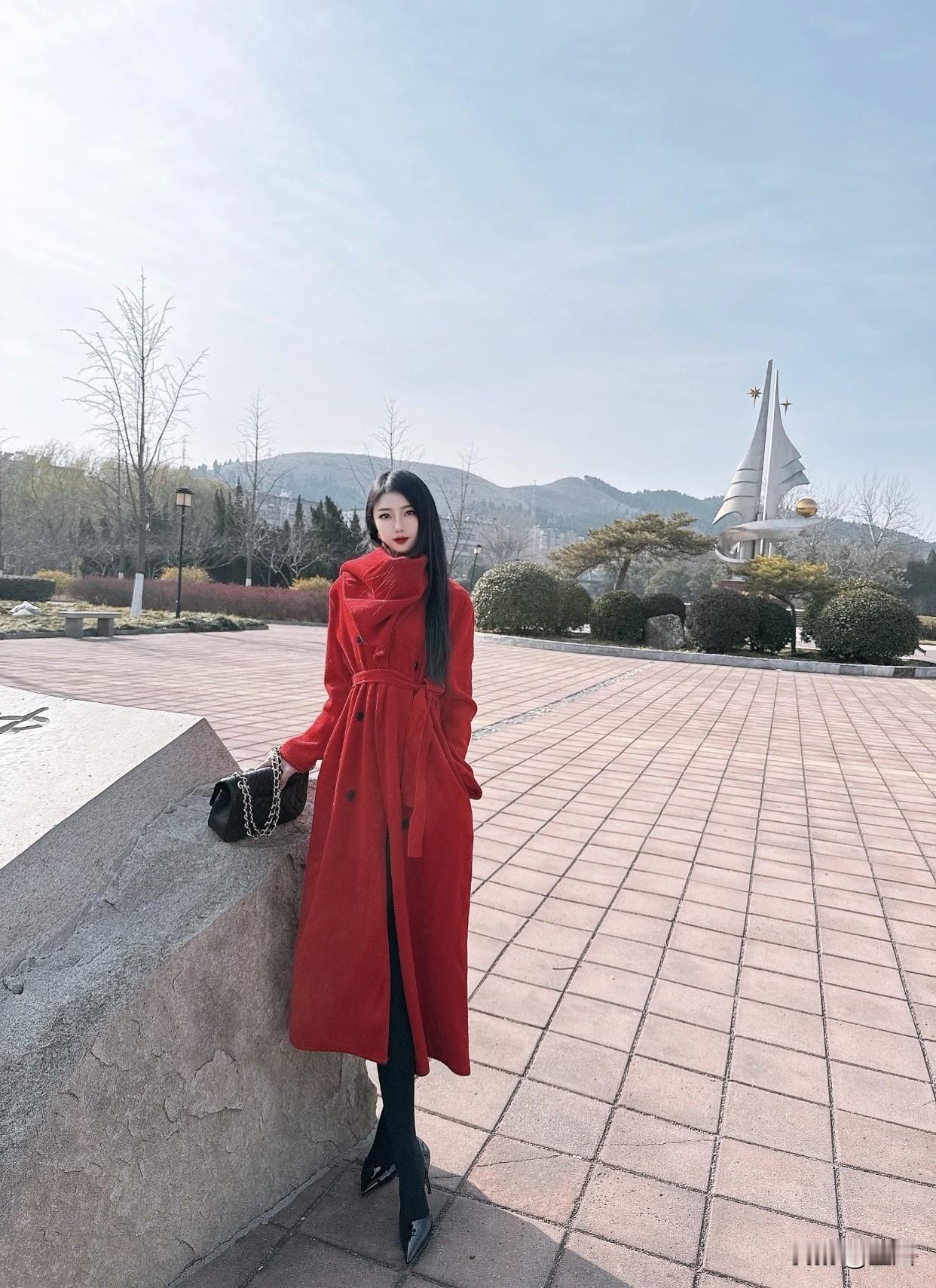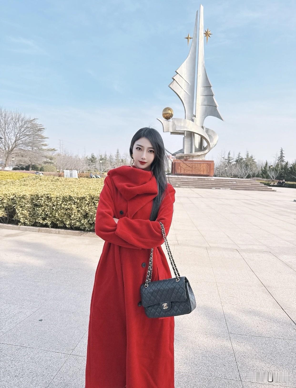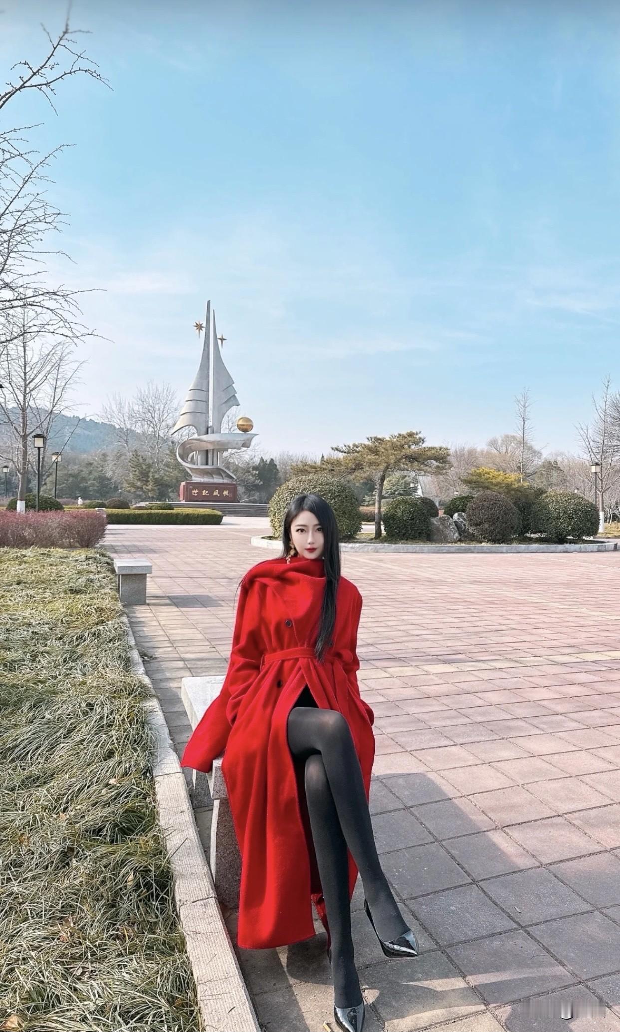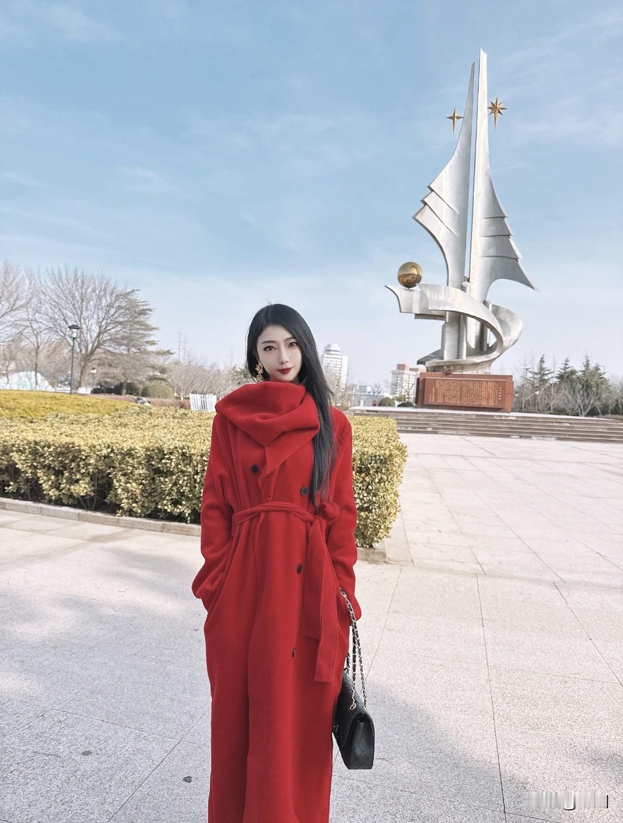 女生怎么搭配服装才能又酷又美冬日暖阳下,红衣少女与现代雕塑的浪漫邂逅。
