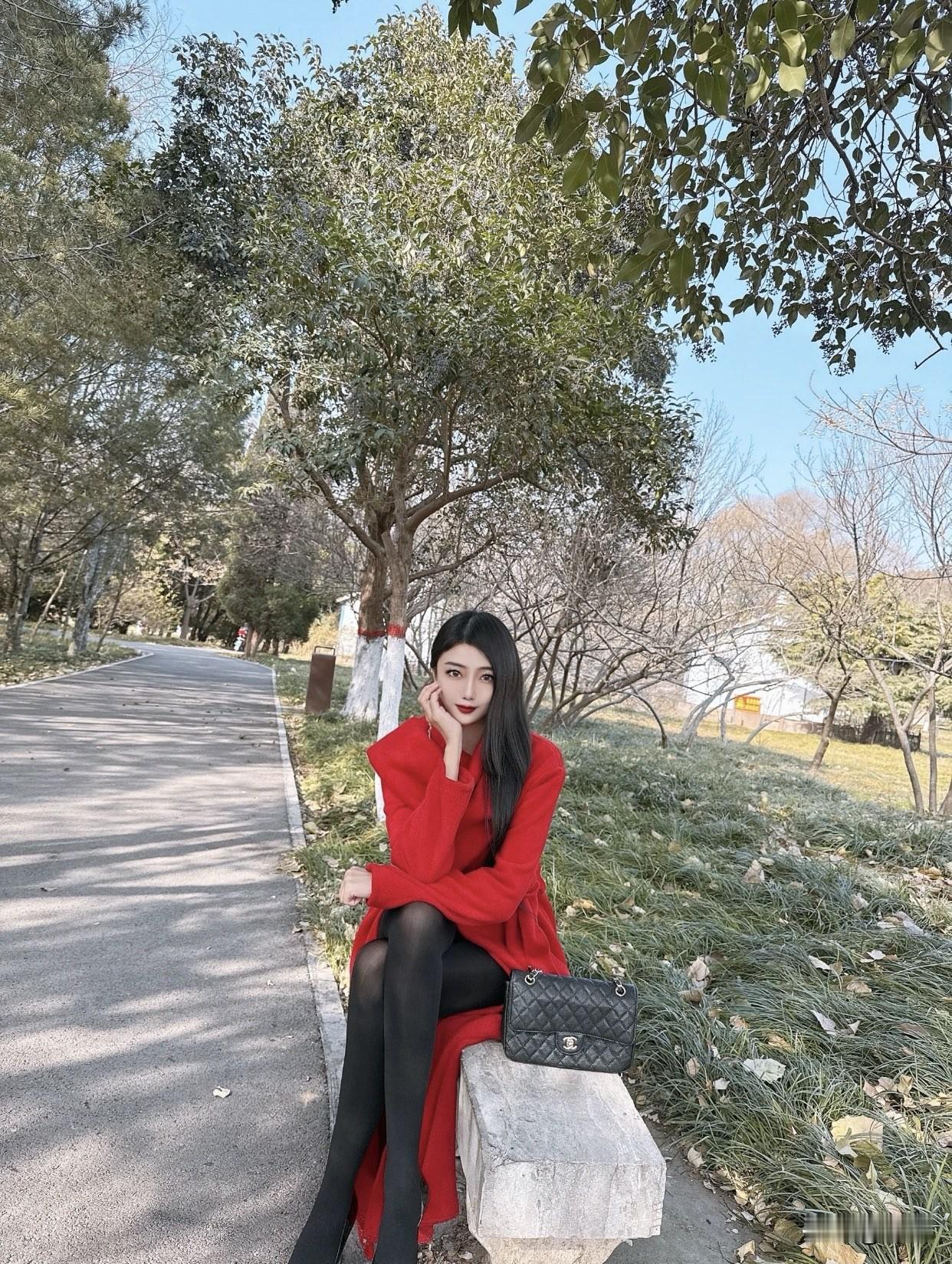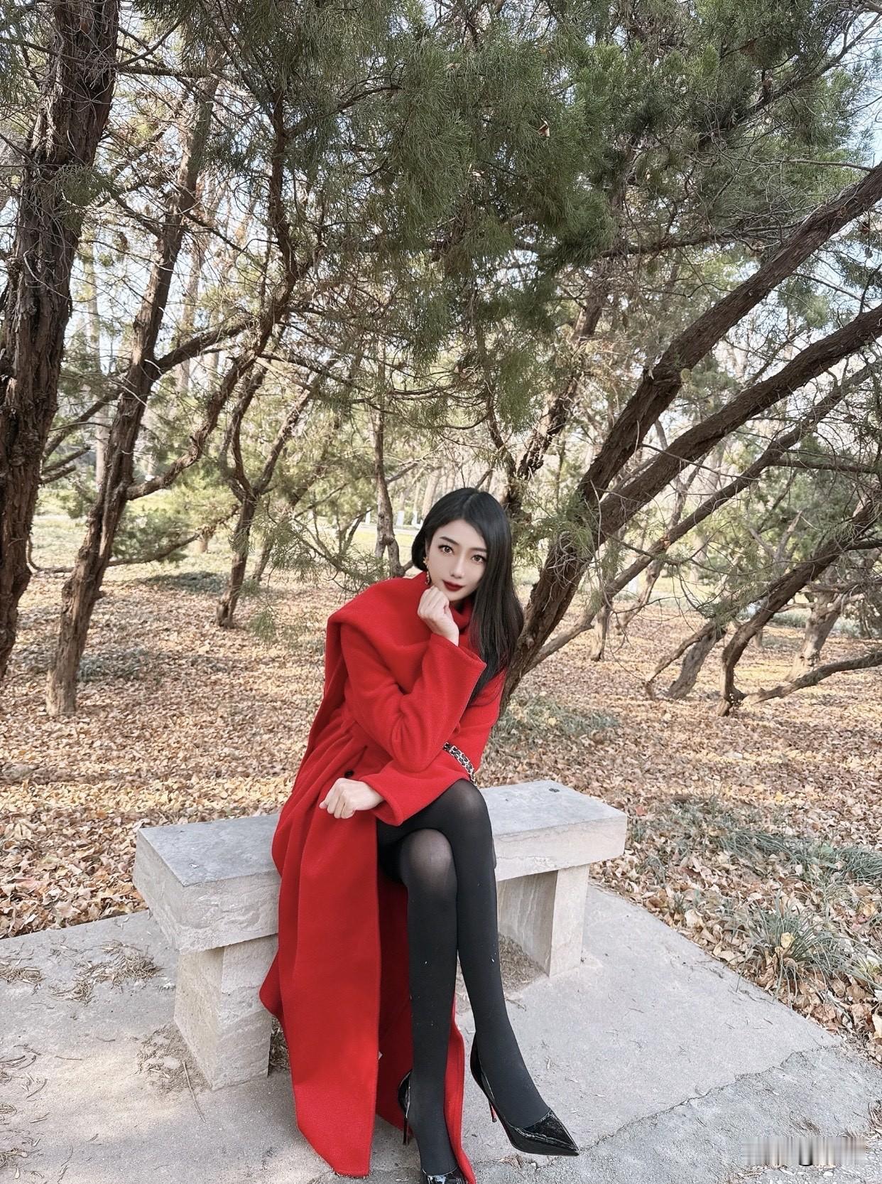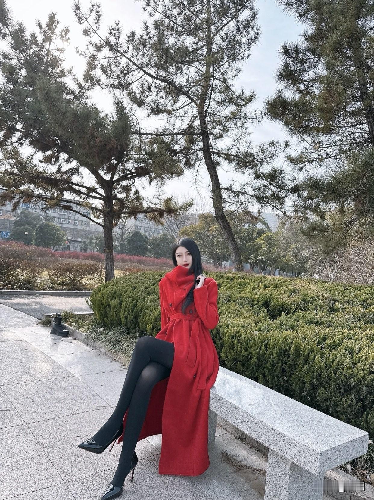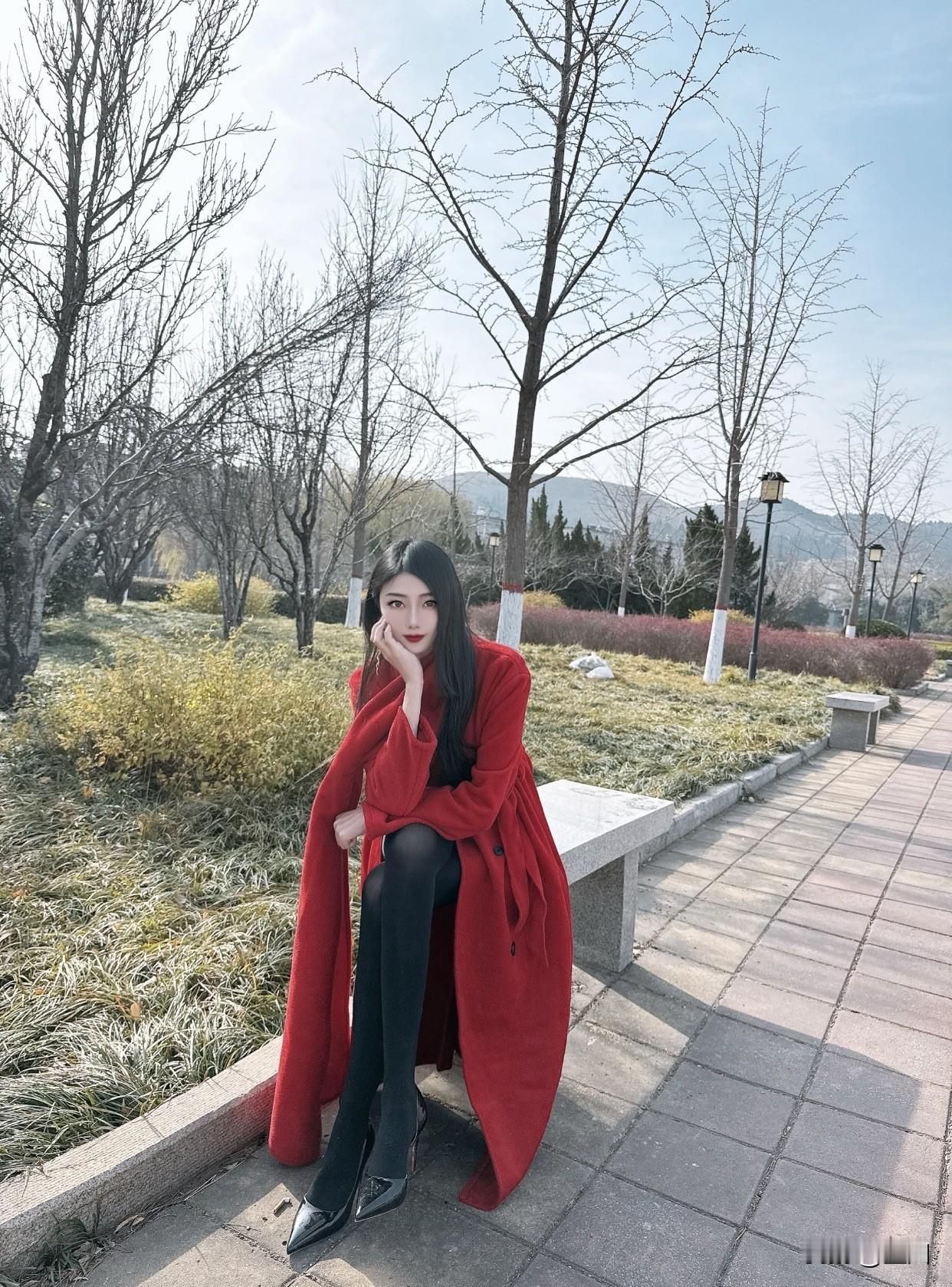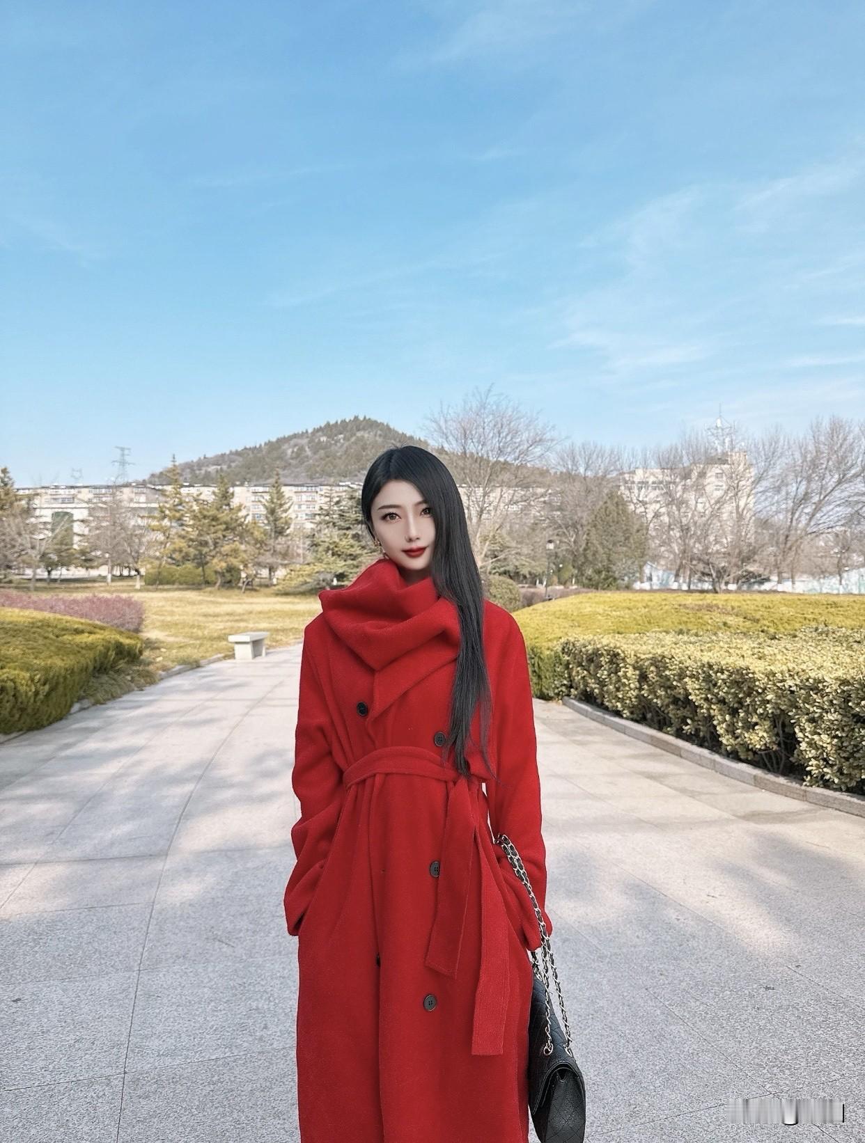 女生怎么搭配服装才能又酷又美冬日暖阳下,红衣少女与现代雕塑的浪漫邂逅。