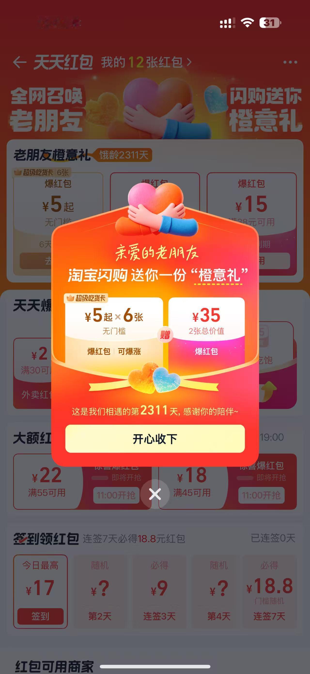 李现喊你上淘宝闪购领老朋友福利 本互联网原住民被李现点名了!淘宝闪购全网寻找老朋友发福利,12.12-12.18记得来淘宝闪购搜【老朋友】,账号注册越久红包越厚,还能解锁最多7张免单卡!这波回忆杀福利太浪漫了吧,让我想起我第一次点外卖的时候,饿龄2311天,福利我狠狠收下了!淘宝闪购超级周末 淘宝闪购全网寻老友