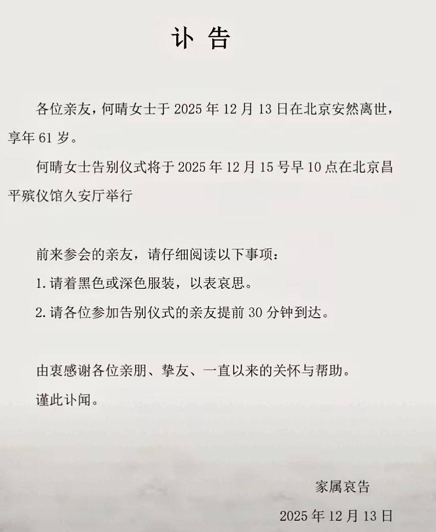 演员何晴于2025年12月13日去世 享年61岁,是唯一演遍“四大名著”的女演员