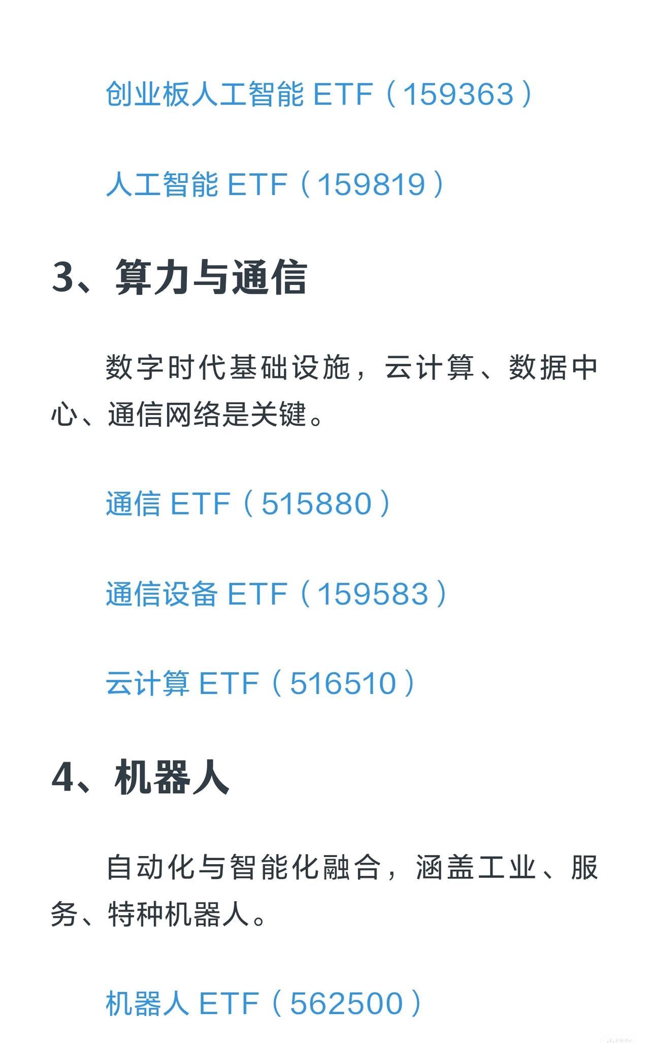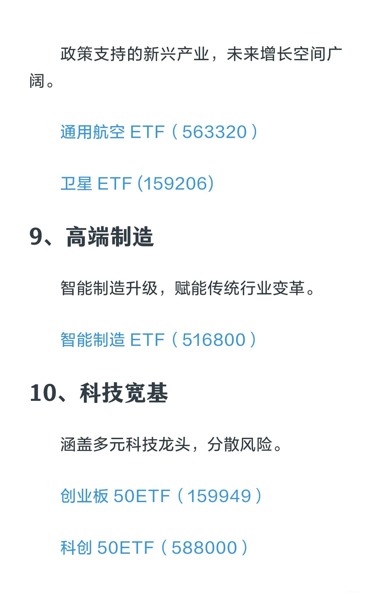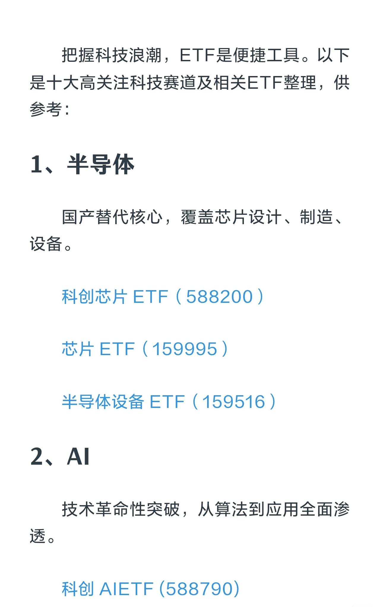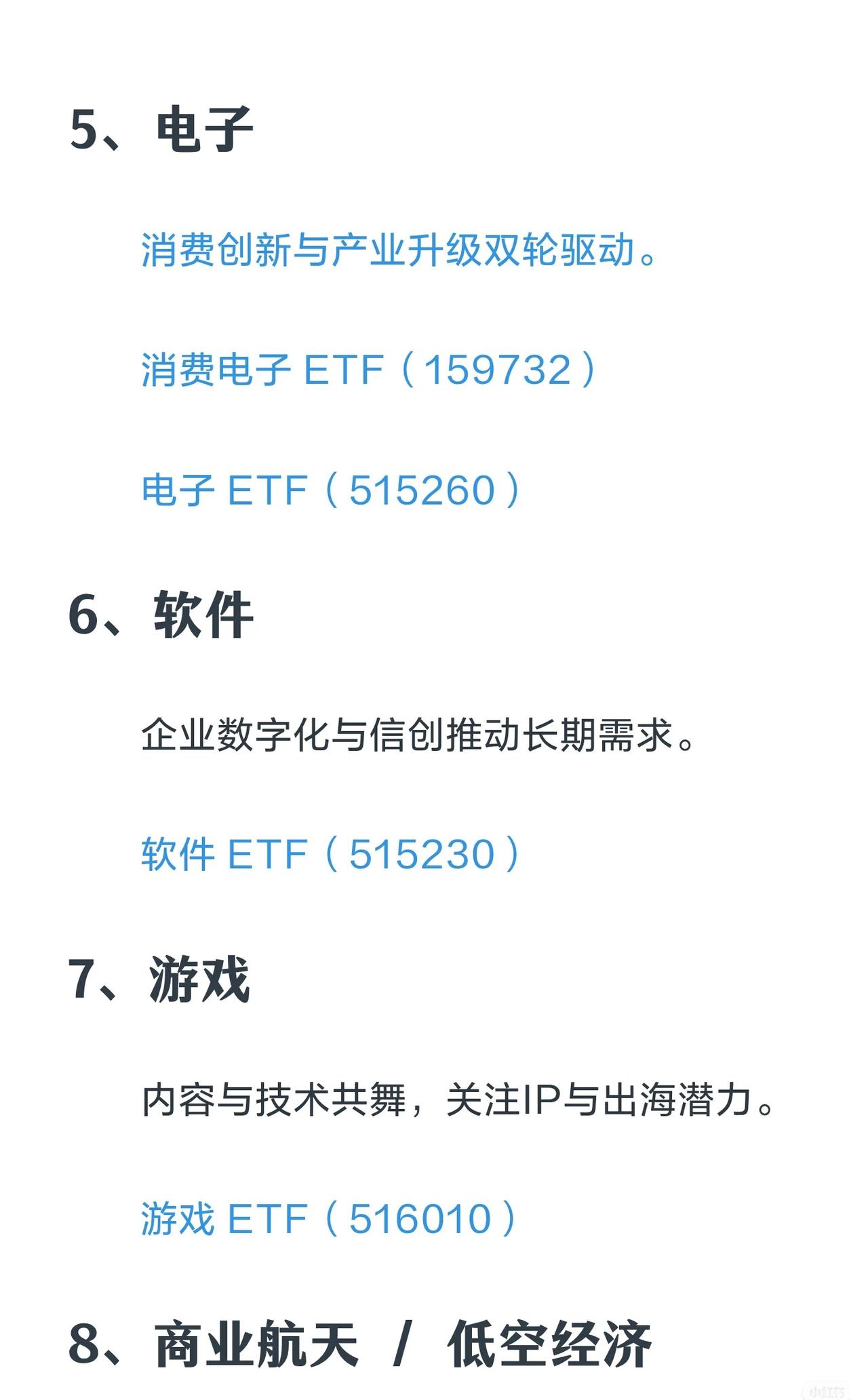 “十大科技赛道ETF整理(精选版)”展开,系统介绍了当前高关注的科技赛道及对应投资工具(ETF),核心内容如下: 开篇点明,把握科技浪潮可借助ETF这一便捷工具,本次整理了十大高关注科技赛道及相关ETF供参考。 具体赛道及对应ETF包括: 1. 半导体:作为国产替代核心,覆盖芯片设计、制造、设备领域,相关ETF有科创芯片ETF(588200)、芯片ETF(159995)、半导体设备ETF(159516)。 2. AI:技术实现革命性突破,从算法到应用全面渗透,对应科创AI ETF(588790)。 3. 算力与通信:数字时代基础设施,云计算、数据中心、通信网络是关键,相关ETF包括通信ETF(515880)、通信设备ETF(159583)、云计算ETF(516510)。 4. 机器人:自动化与智能化的融合,涵盖工业、服务、特种机器人,对应机器人ETF(562500)。 5. 电子:由消费创新与产业升级双轮驱动,相关ETF有消费电子ETF(159732)、电子ETF(515260)。 6. 软件:受企业数字化与信创推动,长期需求明确,对应软件ETF(515230)。 7. 游戏:内容与技术深度融合,需关注IP与出海潜力,对应游戏ETF(516010)。 8. 商业航天/低空经济(未展开具体说明)。 9. 高端制造:聚焦智能制造升级,赋能传统行业变革,对应智能制造ETF(516800)。 10. 科技宽基:涵盖多元科技龙头,可分散投资风险,相关ETF有创业板50ETF(159949)、科创50ETF(588000)。 此外,政策支持的新兴产业(如通用航空、卫星领域)因未来增长空间广阔被特别提及,对应通用航空ETF(563320)、卫星ETF(159206)。 整体内容结构清晰,通过赛道解析与ETF代码的结合,为关注科技领域的投资者提供了聚焦且专业的参考。