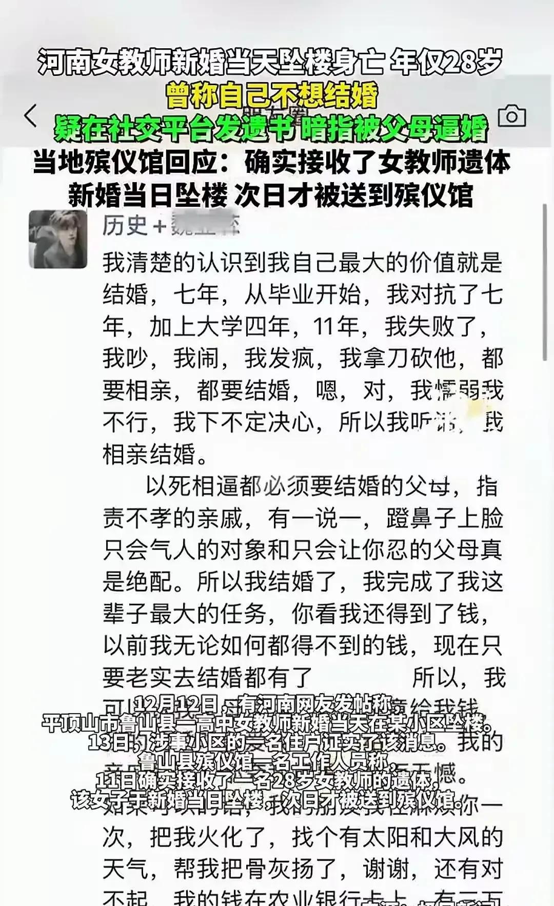 河南一位28岁女教师新婚当天竟然坠楼身亡,这究竟是何原因?生前朋友圈曝光,她曾表示自己并不想结婚,是被父母逼婚的!这背后又隐藏着怎样的故事? 据了解,这位年轻的女教师原本有着美好的未来,却因为婚姻问题走上了绝路。从她生前发布的朋友圈可以看出,她对于婚姻充满了抵触和无奈,甚至表示自己是被父母逼婚的。这样的言论,让人不禁对她的遭遇感到同情。然而,更让人震惊的是,她竟然选择在新婚当天坠楼身亡,这一举动无疑给男方家庭带来了巨大的打击。有网友表示,虽然死者为大,但结婚当天跳楼,确实让人难以接受。定亲、看日子、结婚,这些流程都不是一天两天能完成的,为何她偏偏要选择在当天结束自己的生命呢?也有人质疑,既然死都不怕,为何不勇敢地逃离这段不幸福的婚姻,去追求自己的幸福呢?这背后或许有着更为复杂的原因,我们不得而知。 这起事件引发了广泛关注,也让我们对婚姻自由和家庭压力有了更深的思考。愿逝者安息,也希望大家能珍惜生命,勇敢追求自己的幸福。对此,你有什么看法呢?快来评论区留言讨论吧!新婚跳楼 女孩坠楼现场 坠楼少女 女生坠楼