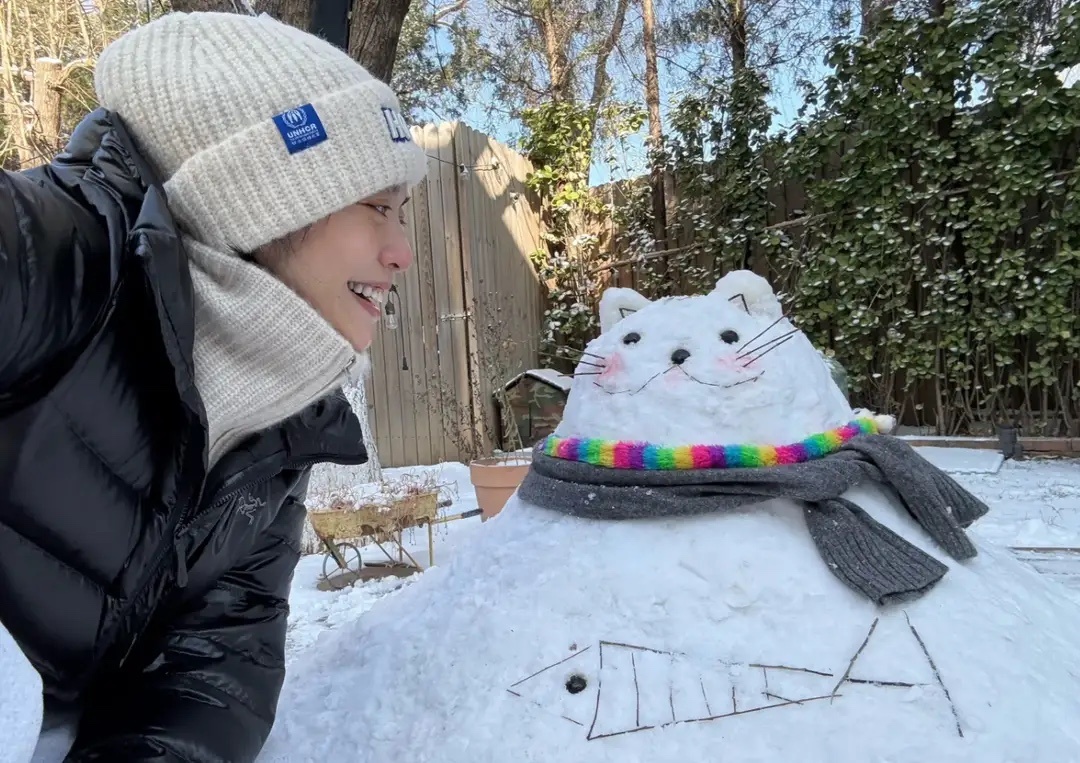 姚晨和儿子在别墅院子堆雪人,12岁土豆帅气出镜,嘴巴很像妈妈!