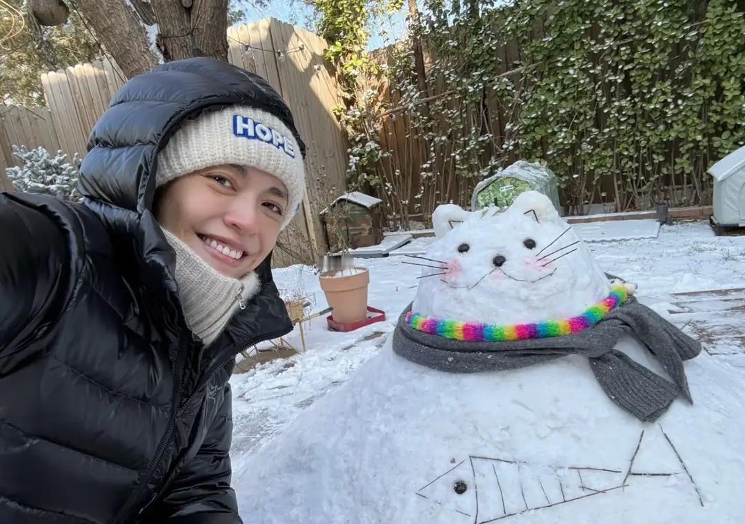 姚晨晒与雪人合照,46岁素颜也超美,12岁儿子高大帅气像妈妈哦!