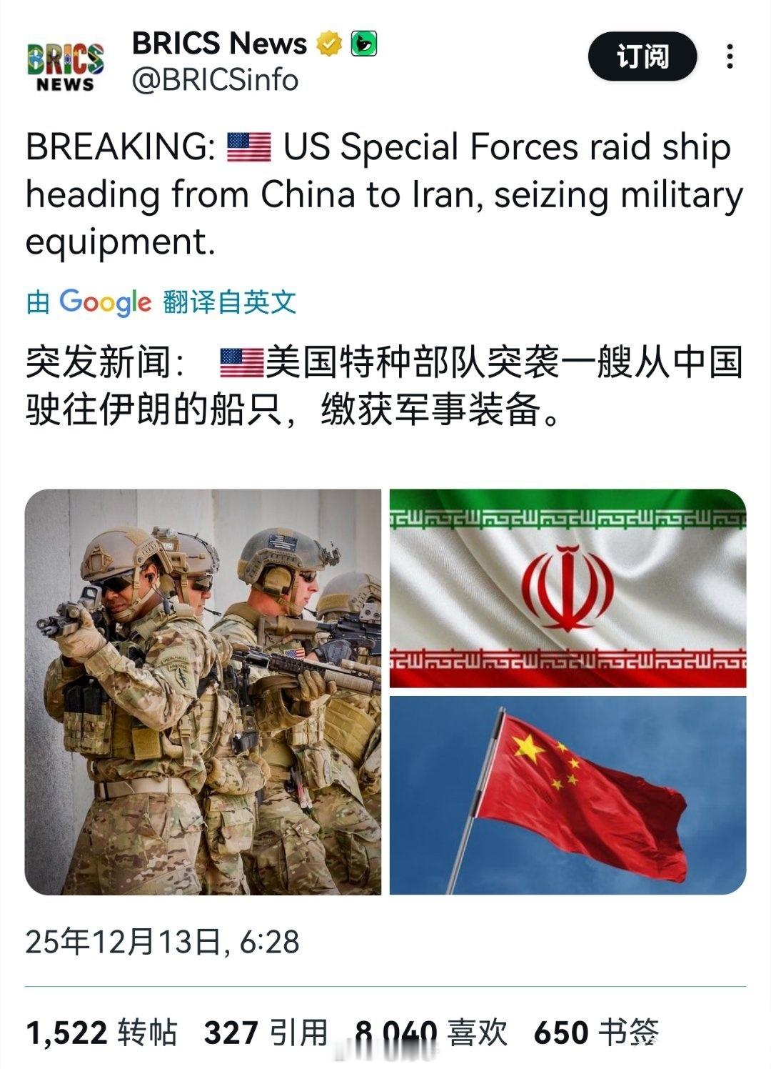 既然美国敢做初一,我们为何不能做十五?据《联合早报》12月12日报道,美军特种部队上月竟在印度洋公然突袭一艘从中国驶向伊朗的船只,强行截获所谓“军事相关货物”并销毁。这种无视国际法、肆意侵犯他国船舶权益的霸权行径,与海盗何异?既然美国敢做初一,我们为何不能做十五,直接截获从美国运往台岛的军售船只?美国此举毫无合法性可言。公海不是美国的后院,岂能由其随意拦截他国正常航行的船只?这让人不禁想起1993年的“银河号”事件,美国同样是毫无证据地强行扣押、检查,最终一无所获却连句道歉都没有。如今,美国依旧奉行“长臂管辖”,将自身意志凌驾于国际规则之上,这种双重标准和霸权逻辑,必须被坚决抵制。从法理和现实角度看,我们截获运往台岛的军售船只完全正当合理。台湾是中国不可分割的一部分,美国对台军售严重违反一个中国原则和《中美三个联合公报》,是对中国内政的粗暴干涉。根据《中华人民共和国海警法》,中国海警在管辖海域有权对外国船舶进行登临检查,对于危害国家主权安全的船只,更可采取强制措施。美国能在印度洋拦截他国船只,我们为何不能在自家门口,对那些运送违禁军火、破坏国家主权的船只进行拦截?从能力上看,中国早已不是当年那个在海上无力维护自身权益的国家。如今,中国海警力量不断壮大,常态化巡航已覆盖台岛周边海域,具备了拦截、查扣相关船只的充分能力。东部战区的“联合利剑”系列军演,更展示了强大的封控与打击能力。美国既然开了“公海拦截”的恶劣先例,就要做好被反制的心理准备。我们一贯主张和平解决争端,但面对美国的步步紧逼,绝不能一味退让。截获运往台岛的军售船只,不仅是对美国霸权的有力回击,更是维护国家主权和领土完整的必要之举。美国若继续执迷不悟,终将自食其果。专栏 · 中美博弈|俄美博弈|中俄联手|寰球动态