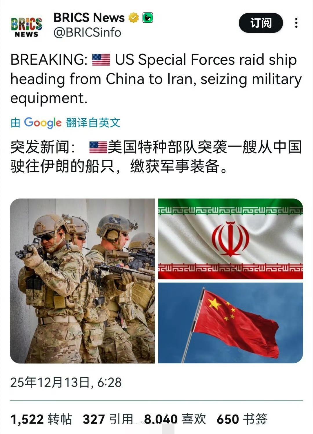 美国再次上演“银河号”闹剧! 据《联合早报》12月12日消息,上月美军特种部队在印度洋突袭一艘从中国驶往伊朗的船只,强行截获所谓“军事相关货物”并销毁。这简直就是1993年“银河号”事件的翻版,当年美国也是毫无证据地扣船检查,最后啥都没查到,连句道歉都没有。 美国政客那副傲慢无理的样子,真让人作呕。他们总喜欢无端挑衅,完全不可礼遇。面对这样的美国,跟它讲道理根本没用,就得以牙还牙。一味地退让只会让它变本加厉,必须强硬回击,让它知道我们不是好惹的!