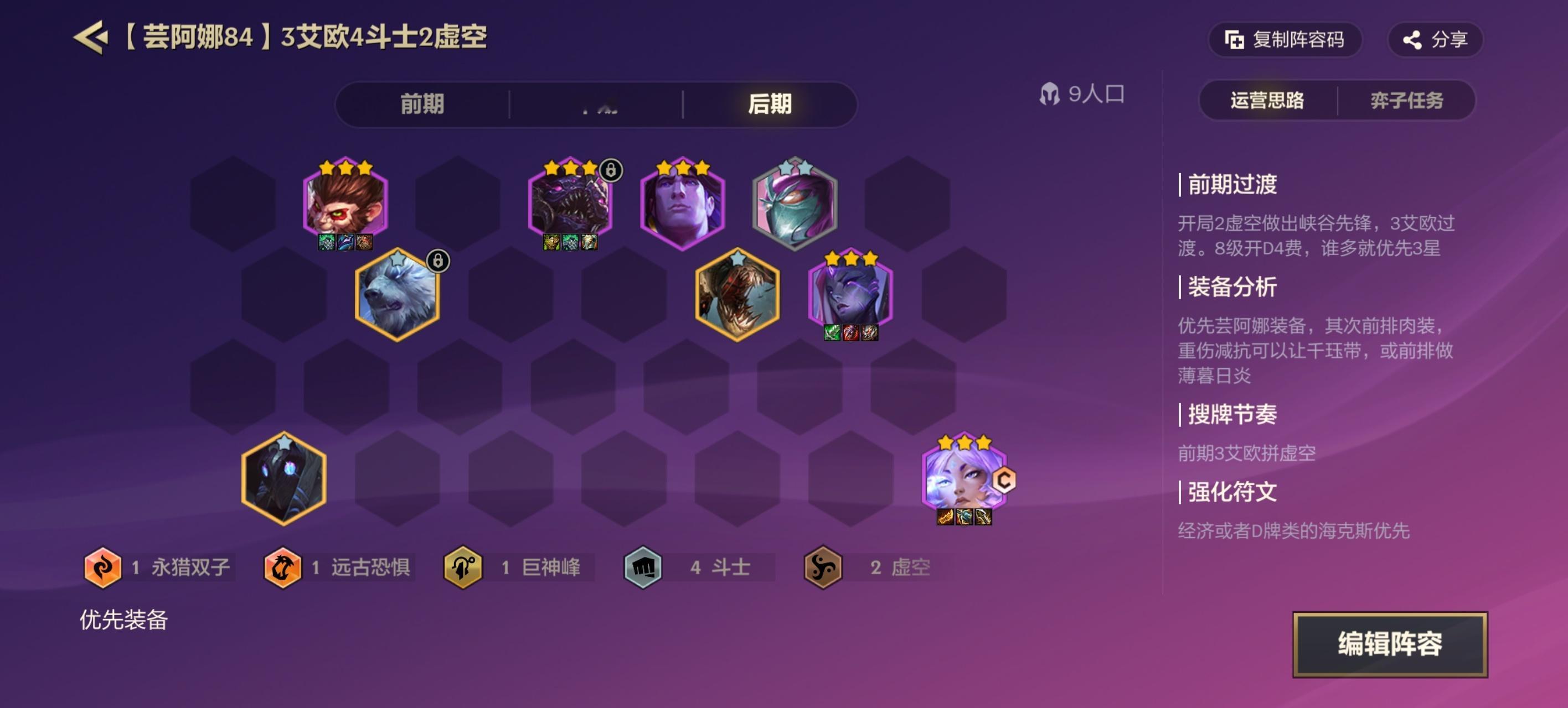 95同行太多了!大家试试「芸阿娜84」!前期:开局2虚空,做峡谷先锋任务,+3艾欧过渡。装备:优先芸阿娜装备:羊刀+海妖+无尽。其次前排峡谷先锋和猴子的肉装。巨补可以让千珏带,或给峡谷先锋日炎。节奏:前期3艾欧拼虚空,8级开D,4费卡谁多就优先3星!符文:经济或者D牌类的海克斯优先。这周更新后,版本最强是「诺克萨斯95」,但同行太多。不是🐔,就是老6。我感觉还不如错开同行,用84上分比较稳!金铲铲