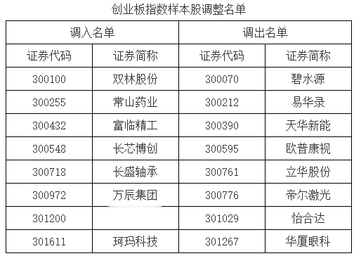 创业板指数更换8只样本,双林股份、常山药业、长芯博创等调入指数。