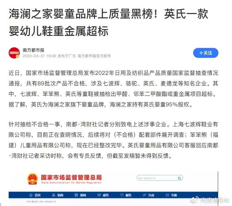 其中比较严重的当属海澜之家旗下品牌英氏的婴幼儿鞋被国家市监局通报重金属超标。