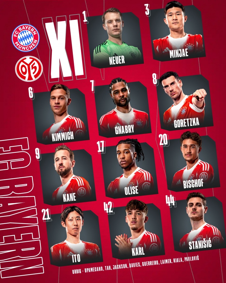 拜仁首发:1-诺伊尔、3-金玟哉、21-伊藤洋辉、44-斯坦尼西奇、6-基米希、8-格雷茨卡、20-比朔夫、42-伦纳特·卡尔、7-格纳布里、9-凯恩、17-奥利塞