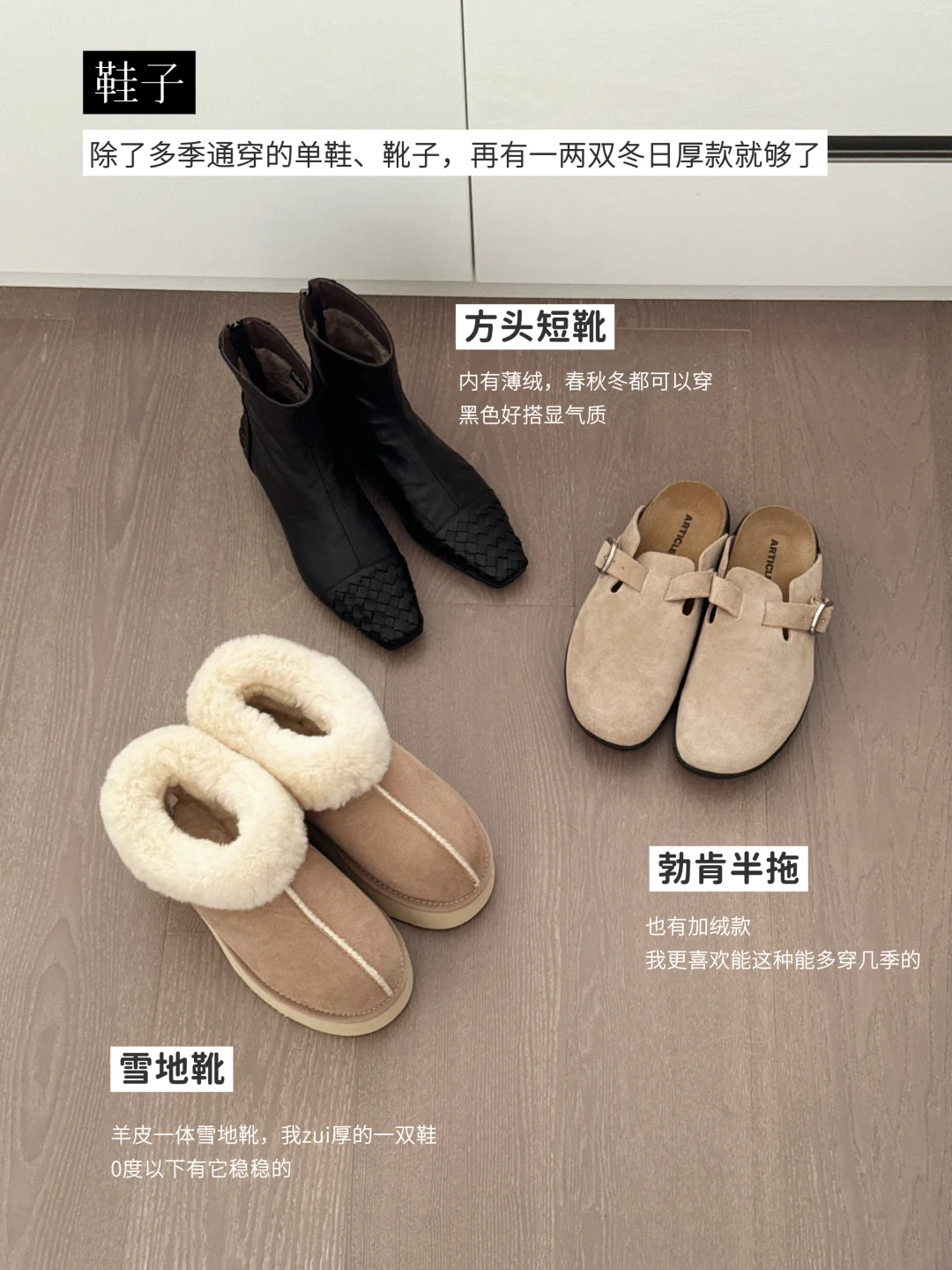 鞋子除单鞋、靴子,再有一两双冬日厚款就够了