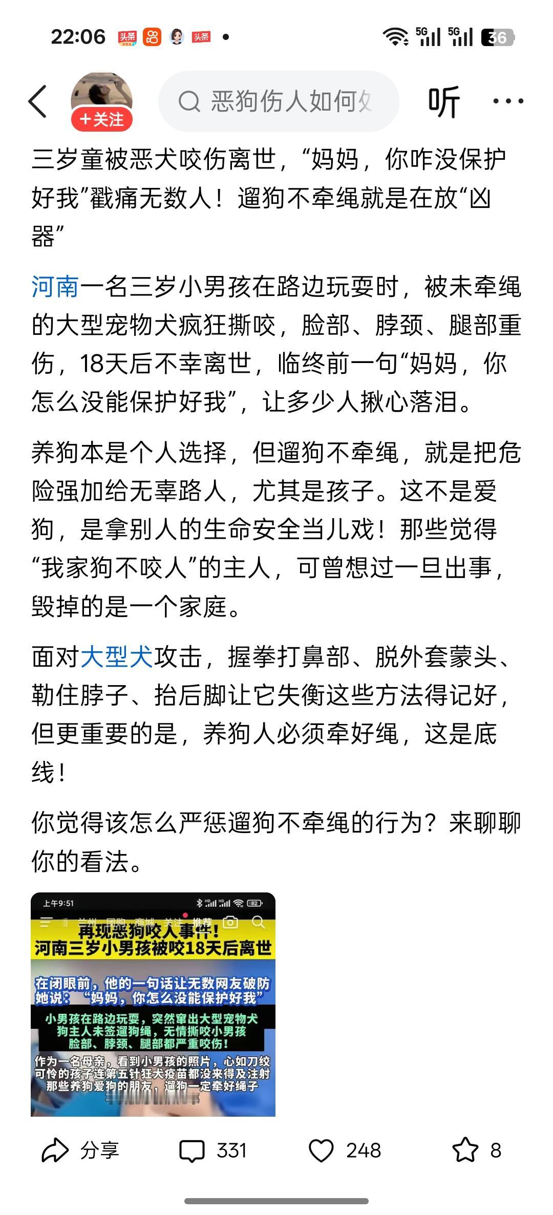 今天刚和一朋友聊完,她侄女两岁多,她带着去小区里玩,小区有家人,养了四条大狗,不栓绳带出来,往她们这里扑过来,她吓得把侄女举高,自己拼命踢,大喊驱赶,狗主人坐在亭子里看手机,根本不管!她破口大骂了,狗主人才不紧不慢过来把狗赶走!我这朋友直接急了,她家一楼,让孩子奶奶把小侄女带回去,自己追着狗主人骂,打电话给物业,报警,找社区,最后狗主人也只是道歉,因为说没咬着人!