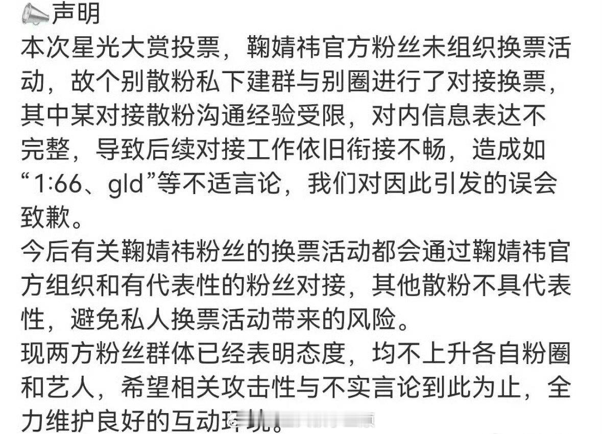 魔道祖粉澄清鞠婧祎粉丝星光大赏换票事件,并表达了歉意