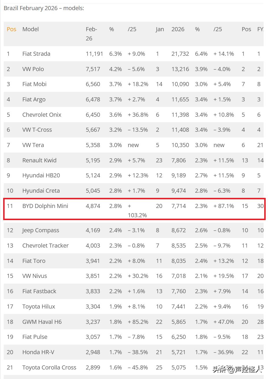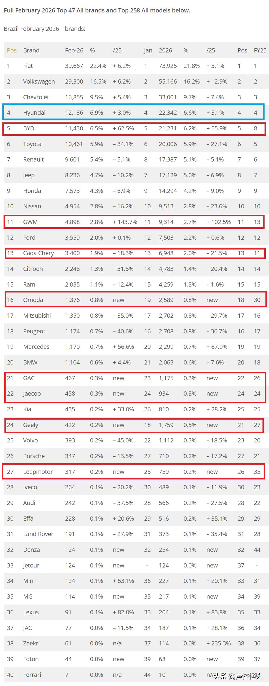 在南美最大的汽车市场巴西,比亚迪也紧跟现代后面。2026年2月,现代销售了12136辆新车,市占率为6.9%,排名第四。比亚迪销量了11430辆,市占率为6.5%,排名第五。