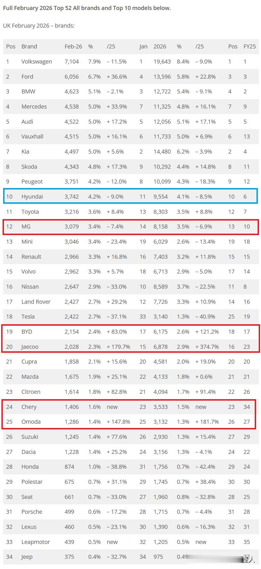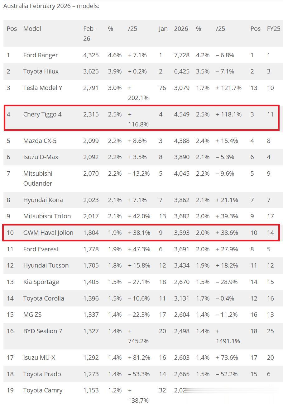 韩国汽车在澳大利亚的存在感一直很强,起亚和现代是前十名的常客,市占率接近14%。但到了2026年2月,中国汽车销量增长了50.5%,中国超越泰国已成为澳大利亚最大的汽车进口国。而我们从单品牌来看,现代和比亚迪的销量已经非常接近。2月现代销量为6266辆排名第五,比亚迪为5323辆,排名第六。起亚销量较高,一共销售了6710辆。另外一个中国品牌奇瑞进步神速,包括子品牌在内一共销售了4753辆新车。