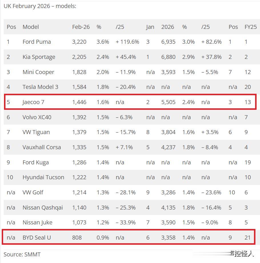 顺理成章地,杰酷7成为最畅销的中国车型,比亚迪海豹U也进入榜单中。