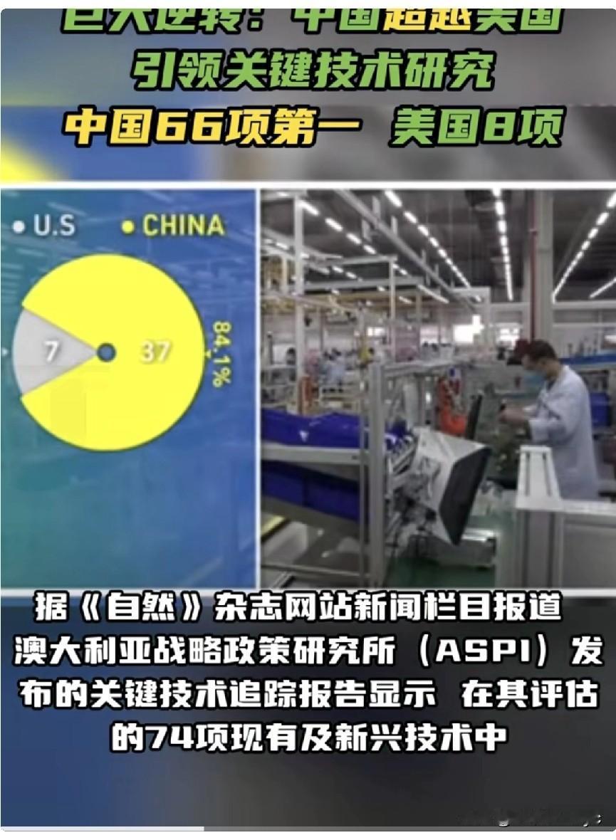 近日,独立智库澳大利亚战略政策研究所(ASPI)发布的一项关键技术追踪报告显示,中国在近90%的关键技术领域处于领先地位。——当地时间12月12日,《自然》杂志网站新闻栏目进行了报道。 ASPI在2025年的报告中评估了74项现有和新兴技术的研究,中国在其中66项排名第一,涉及领域包括核能、合成生物学和小型卫星等。美国则在剩余8项技术中位居榜首,包括量子计算和地球工程。 ASPI的这份报告,确实描绘了本世纪以来全球科研格局一次“剧烈的反转”。揭示了一个关键趋势:中国在数量庞大的关键技术前沿研究上,已经实现了从跟随到领先的跨越。这主要得益于其长期、系统的投入和独特的创新模式。 然而,这并不等同于中国在所有技术产业上都已全面领先。从“研究论文领先”到“技术产业领先”,中间还隔着工程化、商业化、生态构建等多重挑战。全球科技竞争,特别是中美之间,正在进入一个更为复杂的新阶段。 美国并未“崩溃” 学者观点:专注于技术创新的政治经济学家表示,这一分析不应被解读为“美国实力的崩溃”,美国在全球这些技术领域仍然是重要角色。 美国仍保持研究领先的领域包括量子计算、地球工程等,均属于前瞻性极强的尖端领域。
