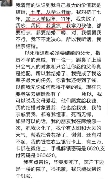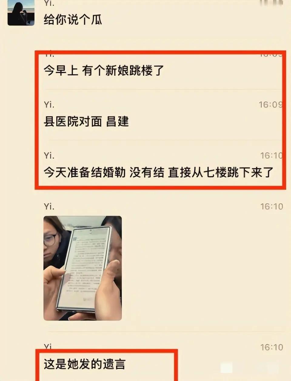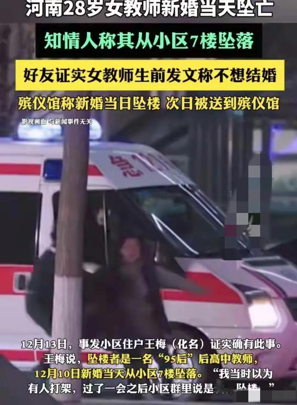《悲剧本可避免?24岁女教师新婚当天从7楼一跃而下,生前曾发文:“其实并不想结婚”》 “喜字还没贴稳,丧讯已传遍全村。” 12月某日,本该是24岁乡村女教师小芳(化名)的大喜之日。然而,就在婚礼当天清晨,她却从娘家7楼阳台一跃而下,当场身亡。这场突如其来的悲剧,让整个村庄从喜庆的喧嚣坠入死寂的哀伤。村干部回应称,“她可能有抑郁症,两家都很悲伤内疚,没有其他纠纷”。而小芳生前在社交平台留下的那句 “其实并不想结婚” ,如今读来,字字泣血。 1. 悲剧时间线:从婚礼清晨到生命终点 ⏳ 关键节点: 婚礼前夜:小芳在娘家准备次日婚礼,情绪未见显著异常。 悲剧清晨:婚礼当日清晨,家人发现小芳从7楼阳台坠亡。 现场:喜字、红毯仍在,婚庆装饰与突如其来的死亡形成刺眼对比。 后续:婚礼即刻取消,两家陷入巨大悲痛,警方介入排除他杀。 2. 关键回应与生前信号:抑郁阴影与无声呐喊 💬 官方与家属回应: 村干部:“她可能有抑郁症,两家都非常悲伤、内疚,没有任何经济或其他纠纷。” 家庭情况:虽在农村,但经济条件尚可,并非因彩礼、物质问题产生矛盾。 家属情绪:沉浸在震惊与悲痛中,对具体细节不愿多谈。 📱 生前信号: 小芳生前曾在社交平台发布动态,透露出对婚姻的迷茫与压力。 最揪心的一条:她曾写道:“其实我并不想结婚”,但这条动态未引起足够重视。 同事反映,她近期情绪较为低落,但教学工作正常,未向外明显求助。 3. 深度剖析:悲剧背后的多重可能 🔍 潜在原因分析: 抑郁症的隐形枷锁: 抑郁症患者常隐藏真实情绪,尤其在“喜庆”场合更易感到孤立与压力。 “微笑型抑郁”可能让她在人前正常,内心却已濒临崩溃。 婚姻压力的集中爆发: 尽管无经济纠纷,但对婚姻本身的恐惧、对未来生活的焦虑,可能成为压垮她的最后一根稻草。 农村环境中,女性在婚姻选择上可能面临更多无形压力与期待。 社会支持系统的缺失: 生前信号的被忽视,反映出对心理健康问题的认知不足与支持缺位。 “喜庆事”语境下,个人的负面情绪容易被忽略或劝慰压制。 4. 社会警示:关注心理健康,尊重个体选择 ⚠️ 必须正视的问题: 心理健康不是“矫情”:抑郁症是一种疾病,需要专业干预与理解,而非简单的“想开点”。 婚姻应基于真实意愿:无论社会氛围如何,结婚与否、何时结婚,必须是个人清醒、自愿的选择,不应被家庭或社会压力绑架。 重视“求救信号”:亲友需对身边人突然的情绪低落、消极言论保持敏感,及时沟通并提供支持。 💬 网友痛心评论: “那句‘不想结婚’就是求救信号啊,为什么没人接住她?” “抑郁症真的不是开玩笑,身边有亲友这样,一定要逼他们去就医。” “农村对心理健康的认知太缺乏了,悲剧希望换来更多关注。” “红事白事,旦夕之间;抑郁之痛,不容忽视。” 一条鲜活的生命,在本该充满希望的日子里骤然消逝。小芳的悲剧,不仅是一个家庭的破碎,更是对社会心理健康意识的一次沉重叩问。它提醒我们:在张灯结彩的背后,或许有人正在黑暗中挣扎。看见痛苦,倾听无声的呐喊,或许就是我们能阻止下一个悲剧的开始。新婚跳楼 教师坠楼去世