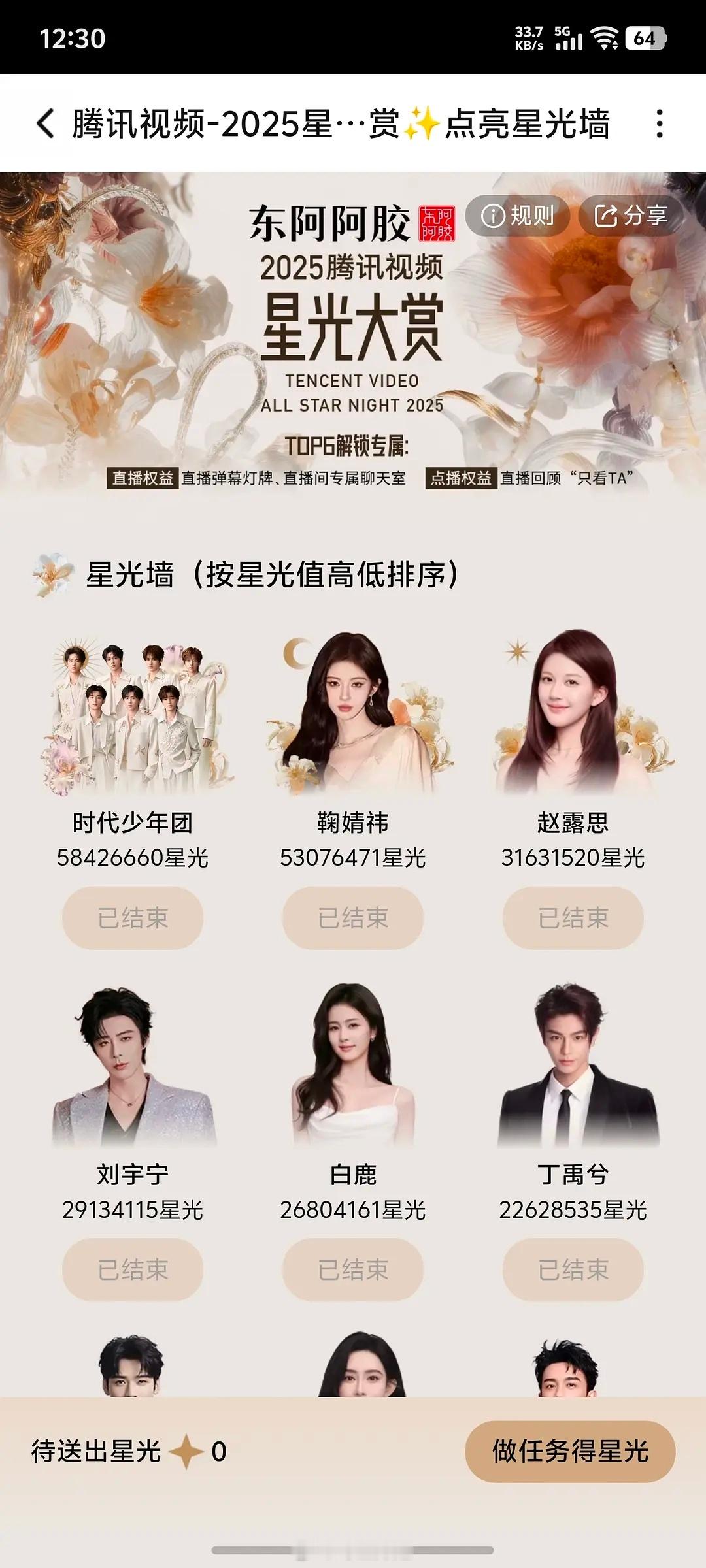 星光大赏星光墙前几名变动了,第一还是时团,白鹿已经第三啦,也是女演员中第一,活粉