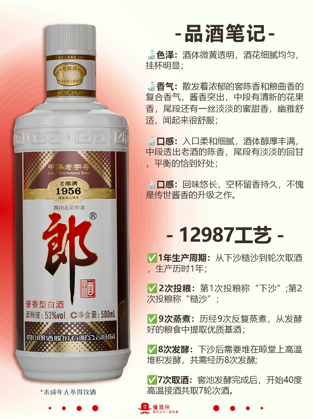 🍶1898年邓惠川在二郎创办絮志酒厂,后在原“凤曲法酒”的基础上酿造出一种“开坛喷香、入口呈酱”的酱香型美酒,以工艺命名为“回沙郎酒”。