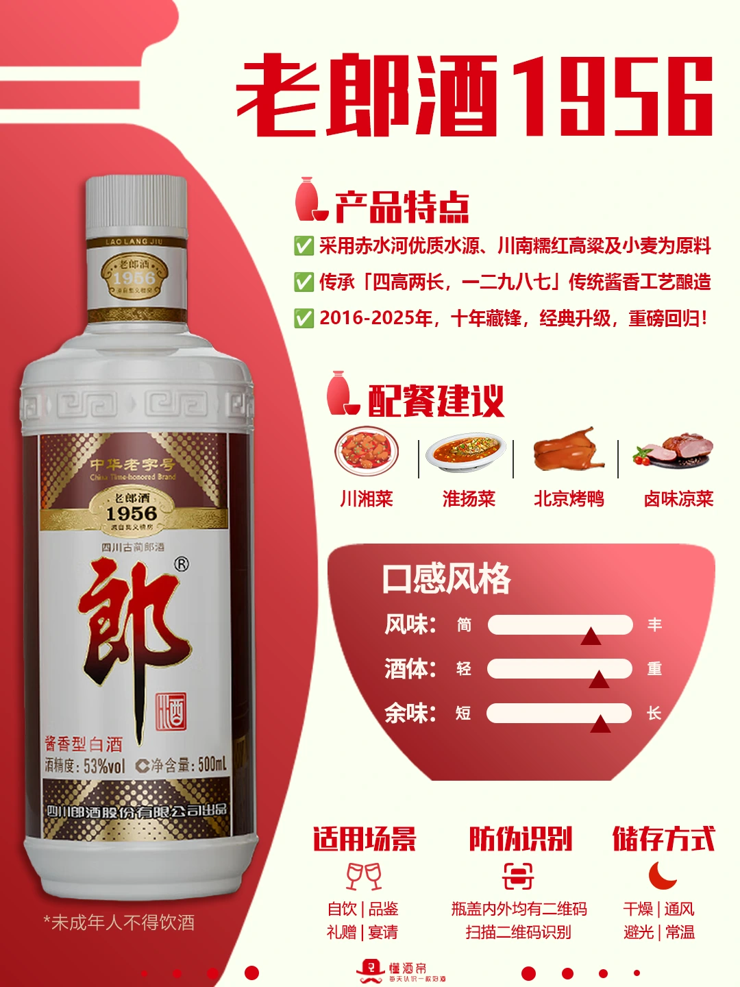 🍶1956年国营四川省古蔺郎酒厂成立,1957年在原产地四川省古蔺县二郎镇恢复生产。
