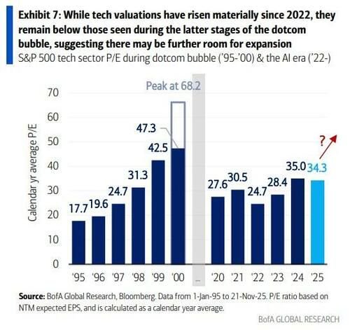 美银指出,虽然美国科技股估值自2022年以来大幅上升,但仍低于90年代末互联网泡沫最疯狂时期的水平。