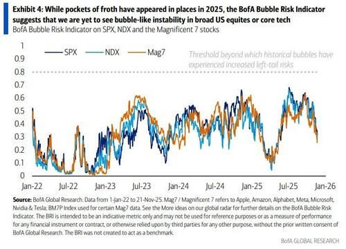 尽管2025年市场已显现典型泡沫特征,但美银的风险指标显示,美国核心科技股尚未进入极端不稳定区域,当前估值水平也远未达到90年代互联网泡沫的疯狂程度。