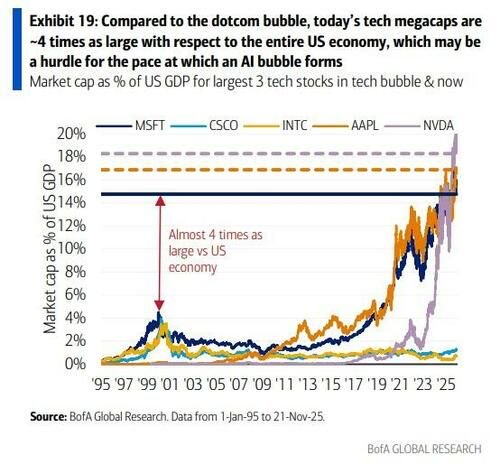 如果英伟达按照思科2000年约200倍的峰值市盈率重新估值,其市值将达到20.8万亿美元。美银警告,这种规模使得核心AI股票可能在没有经历典型泡沫股票不稳定性的情况下,因前瞻性盈利预期的负面意外而出现抛售。