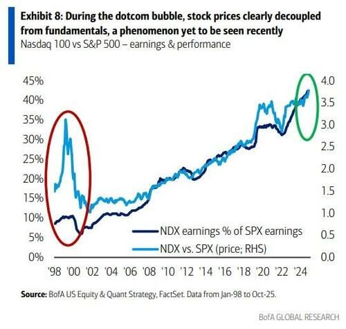 更广泛地说,互联网泡沫时期,股票价格与基本面明显脱钩,而美银表示,在更广泛的市场中尚未看到这种情况。从这个角度来看,估值(以及股价)可能仍有上涨空间。