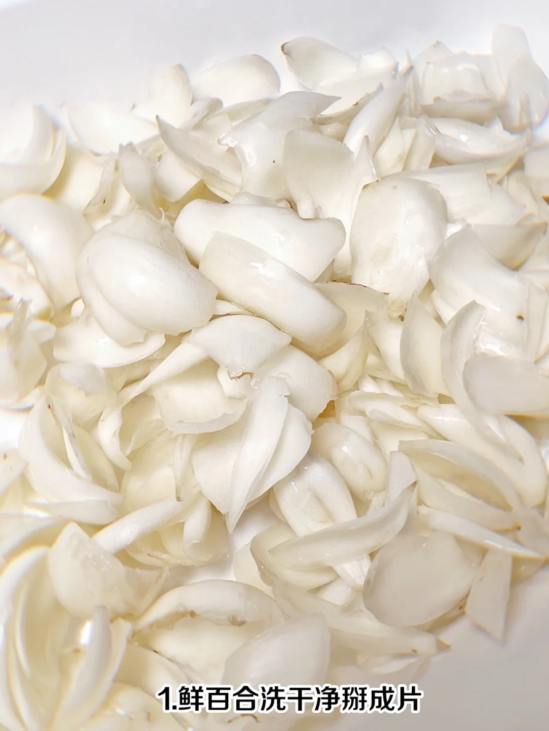 新鲜的食材+简单的做法=彰显食物本身味道的一道菜🌟 步骤: 1、鲜百合洗干净掰成片 2、水开后上锅蒸8分钟 3、加上一勺蜂蜜,就可以开吃啦,甜甜糯糯真不错👍🏻