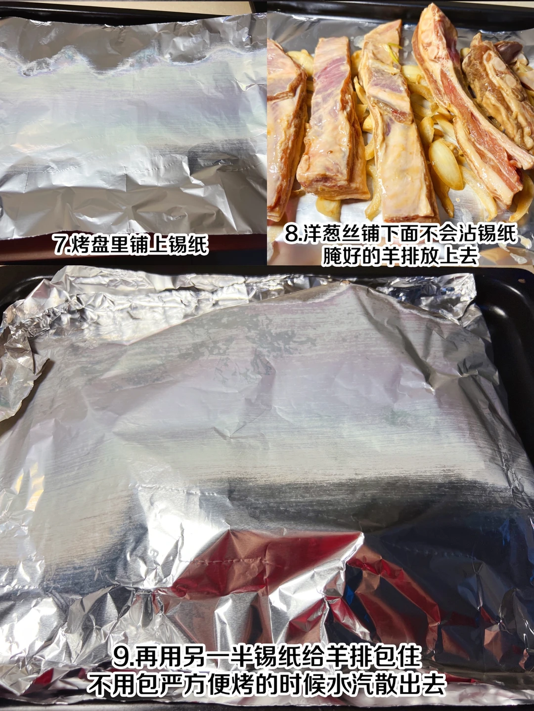 4、烤盘里铺上锡纸,洋葱丝铺下面不会沾锡纸。腌好的羊排放上去,再用另一半锡纸给羊排包住,不用包严方便烤的时候水汽散出去。