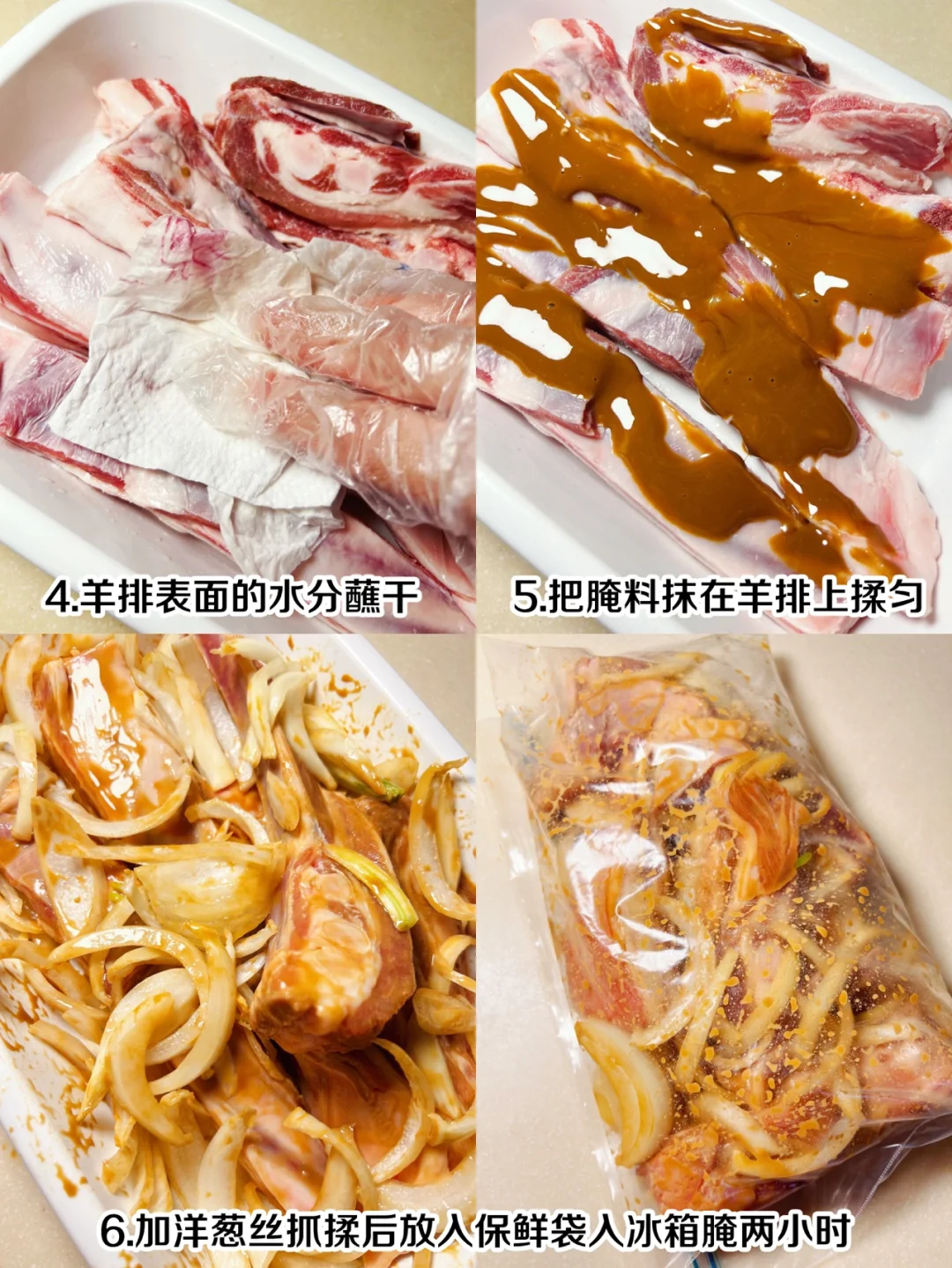 3、羊排表面的水分蘸干,把腌料抹在羊排上揉匀,加洋葱丝抓揉后放入保鲜袋入冰箱腌两小时
