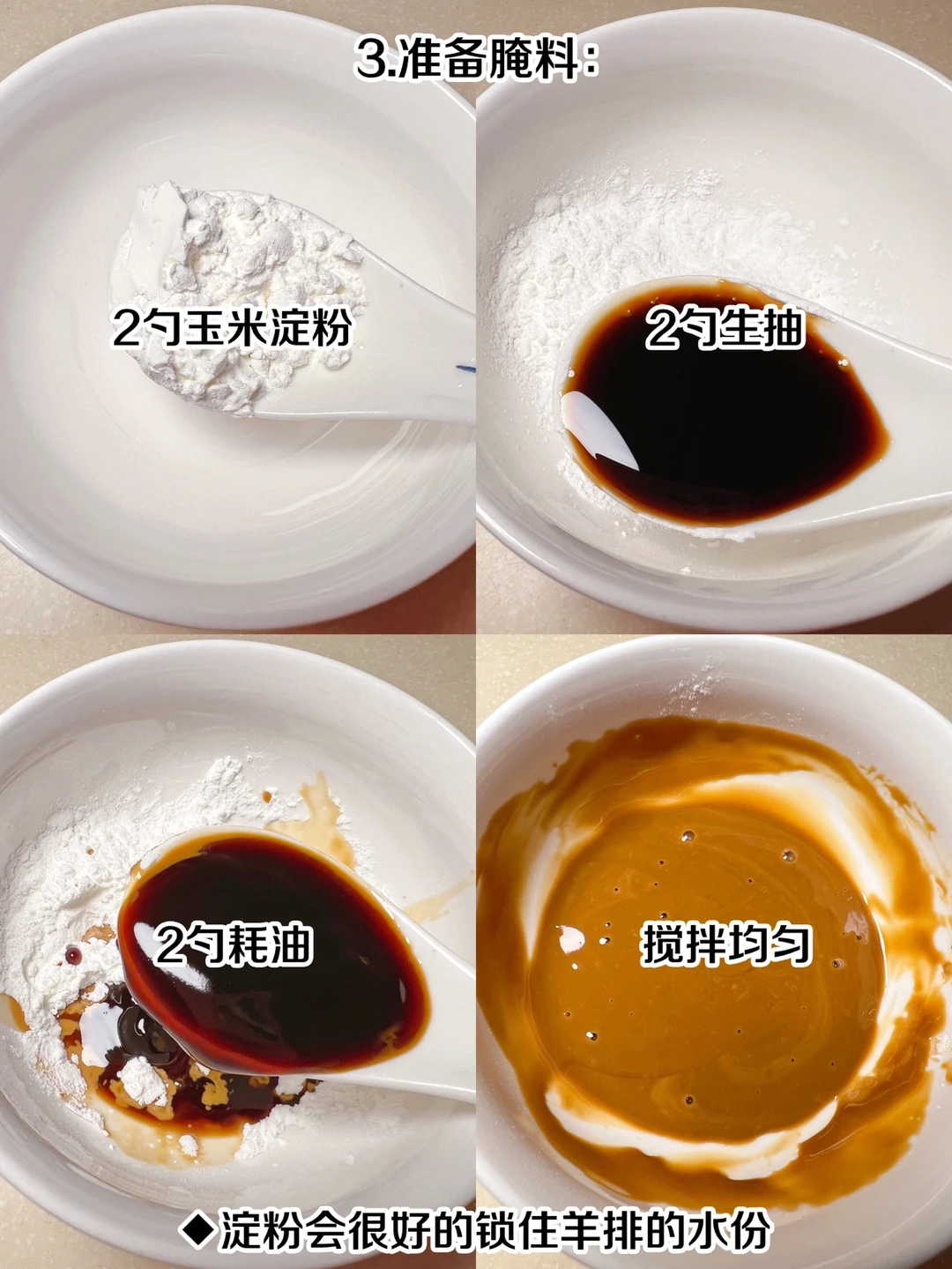 2、准备腌料:2勺玉米淀粉、2勺蚝油、2勺生抽搅拌均匀(淀粉会很好的锁住羊排的水份)