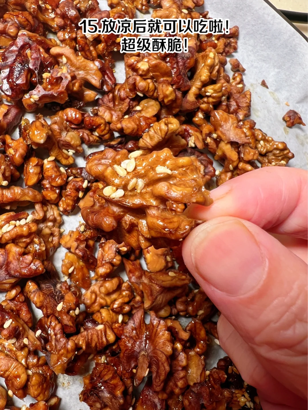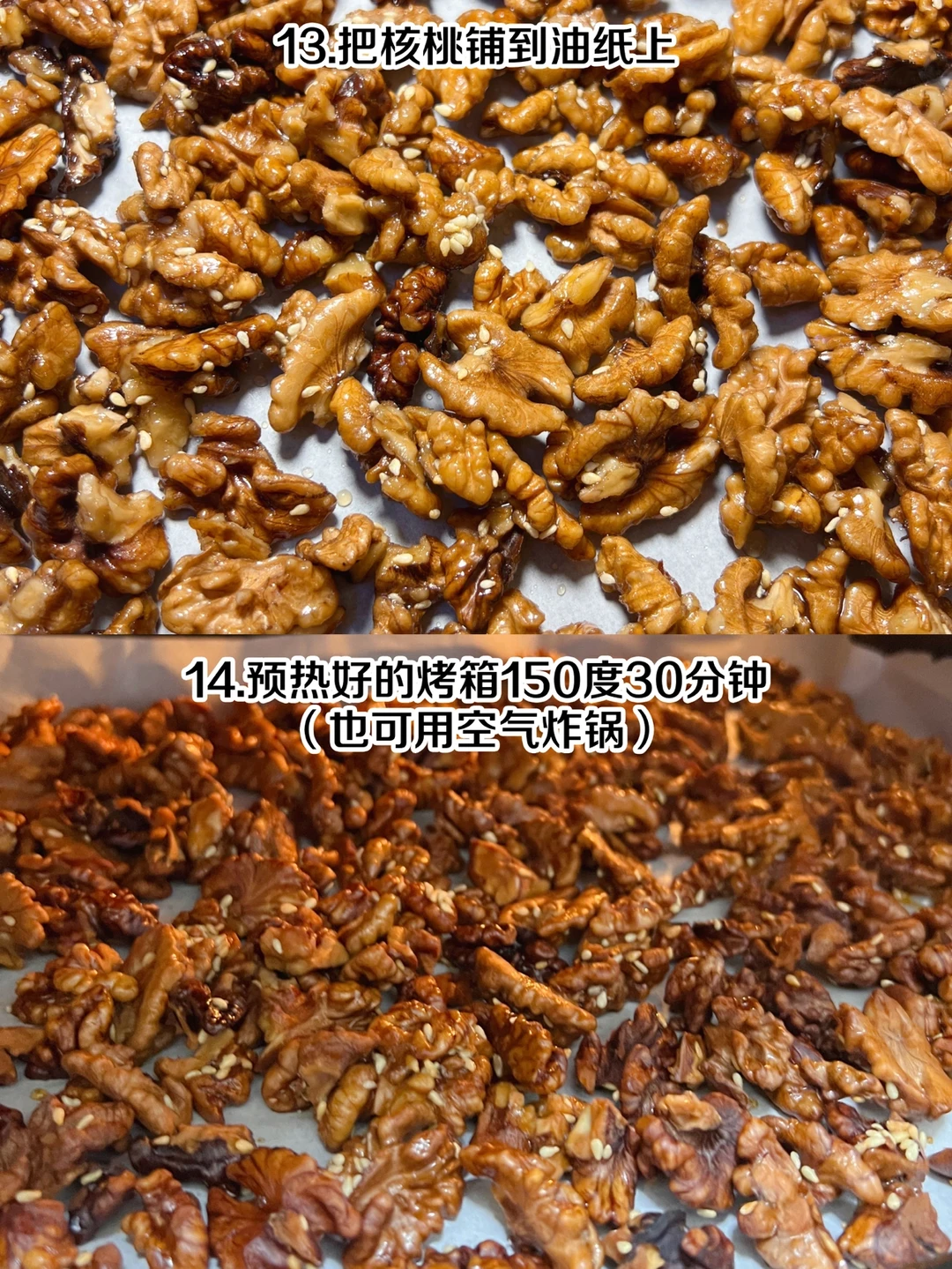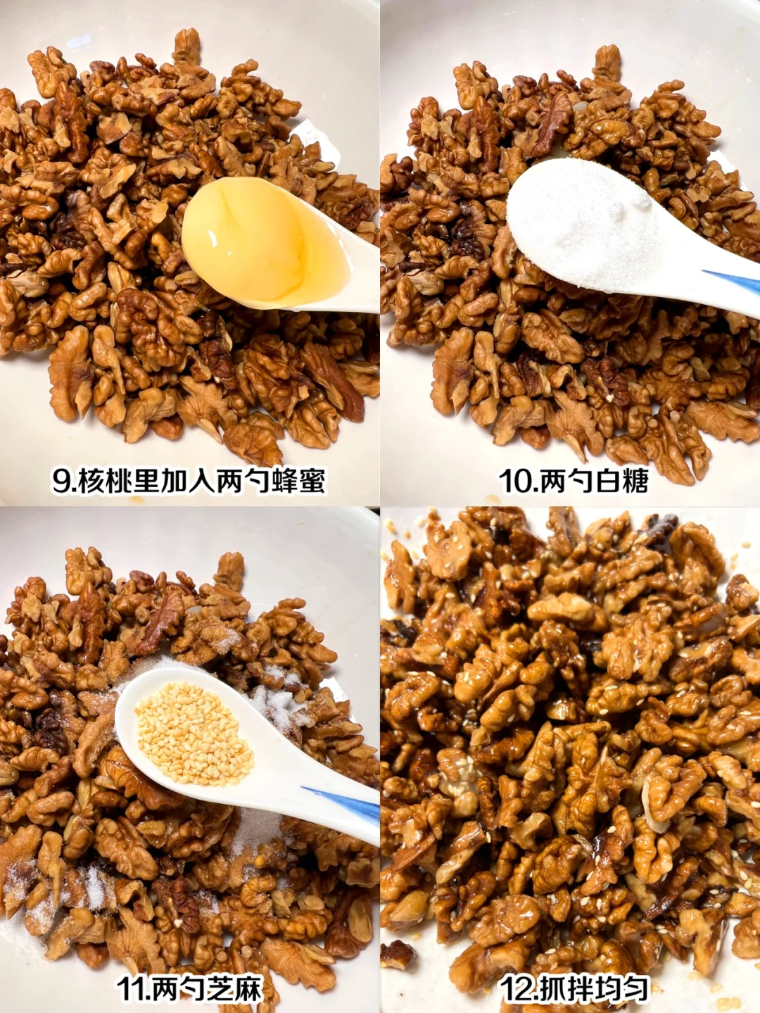 步骤 1、准备核桃 2、去壳剥出核桃仁 3、锅中放适量水,加入一勺小苏打(这样煮核桃可以有效去除核桃的苦涩味) 4、放入核桃开煮 5、等待锅中的水烧开,颜色开始变深的时候,就可以将核桃捞出来了 6、接下来重新烧一锅清水,再次将核桃下锅(这次去除掉小苏打的同时,能让苦涩味去除的更彻底) 7、核桃里加入两勺蜂蜜、两勺白糖、两勺芝麻,抓拌均匀 8、把核桃铺到油纸上 9、预热好的烤箱150度30分钟(也可用空气炸锅) 10、放凉后就可以吃啦,超级酥脆!👍